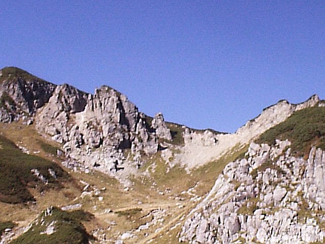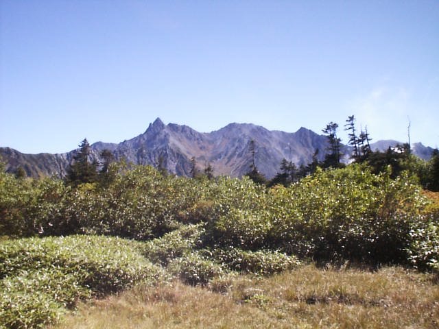 標高2400-2500mに広がるカール形の「秩父平」はマイマツと湿地の草原に覆われ、そこから見える秩父岩の奇峰の林立。休憩には良い場所。弓折岳から秩父平まで約2H。池塘周辺では初夏にはたくさんの高山植物花が見られそう。