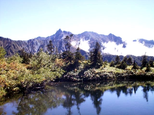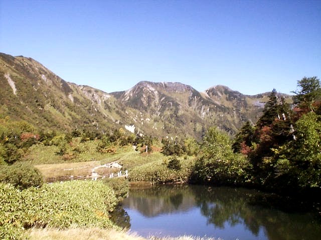 少し急な道を登ると湿地に出る。そこが「鏡平」(標高2300m)。突然、眼前に「槍〜穂高連峰」が現れた。「鏡池」に映し出された槍・穂高連峰とコメツガの木はきれいな風景。ここに泊まれたらと思うほどきれい。暫く湖畔の木製のテラスで休憩。