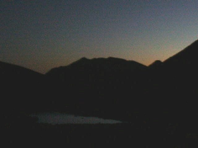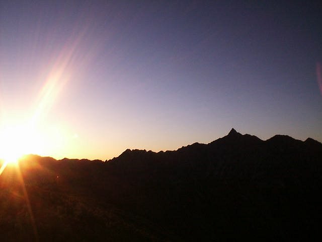 小屋の主人に「槍に隠れてご来光は見られないかも」と云われたが、5:30頃のご来光を見るために、4:00に起床して樅沢岳を登る。未明の夜空は満天の星が輝いていた。しかしこの日の朝は寒かった。気温は0℃。早朝の双六池の周囲は