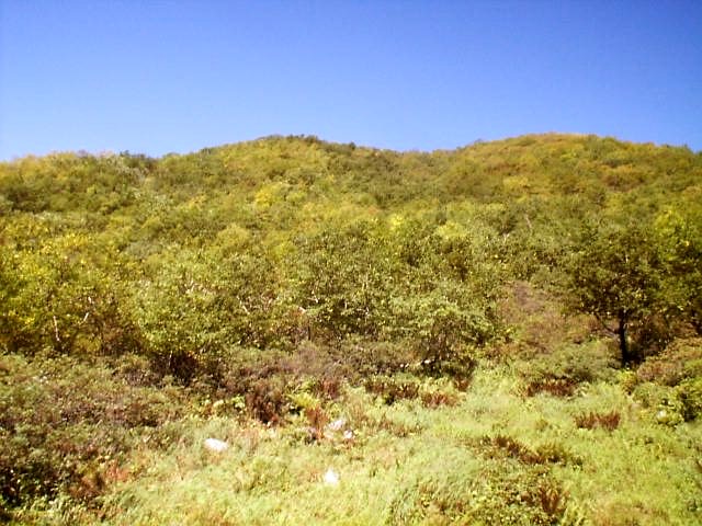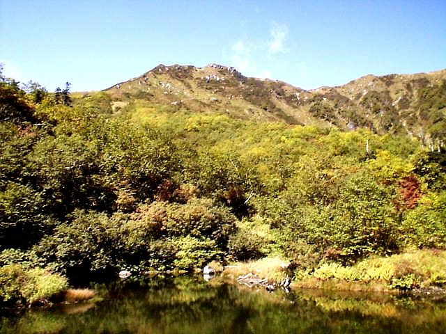 深いガスに包まれ、この日は山の展望は無理かなと思って歩いていたら、シシドウガが原(標高2200m)に出ると雲一つない青空が広がっていた。夏の暑さの影響なのか紅葉は1週間程度遅く、木々が黄色く紅葉し始めていた。シシドウガが原から約1H。