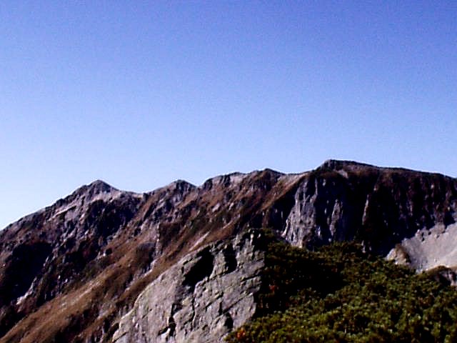 天狗の頭(2909m)・間の岳(2907m)・西穂(2909m)。奥には白い花崗岩の燕岳〜北燕岳の稜線、北には双六岳、鷲羽岳、水晶岳、黒部五郎岳、薬師岳、西には白山と一望できた。時折、穂高側から吹き上げる風は冷たく、秋から冬の訪れを感じた。