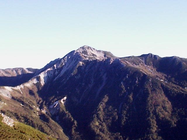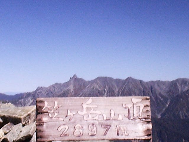 鷲羽岳(2924m)、燕岳(2763m)などが望めた。山頂は風もなく日当たりが良くて暖かく、TシャツでもOKでした。1時間程を費やした。笠ヶ岳山頂の看板は昔のものを使用。山頂であと14山と騒ぐ叔父さんがいた。何でも百名山まであと14峰とか。