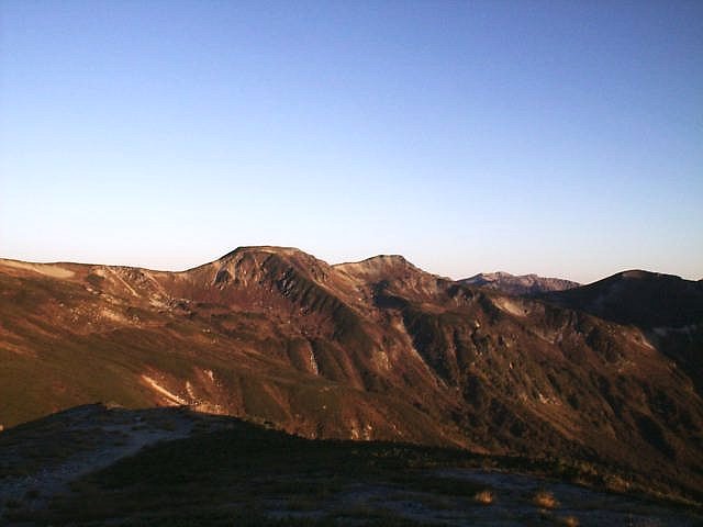穂高連峰のシルエットは美しい。いつもは蝶ヶ岳・常念岳の常念山脈側から槍〜穂高を見ていたが、飛騨側からの山岳風景もなかなか良かった。朝日が反対側のなだらかな双六岳を赤く照らしていた。