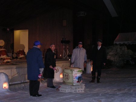白馬錦の鏡割りや子供たちによるキャンドルの点灯。鏡割りされた「白馬錦」が観客に振る舞われた。酒を飲み過ぎてすっかり出来上がってしまった。それにそば茶割りの大町産焼酎「えべや」も頂きました。そば焼きや味噌づけも