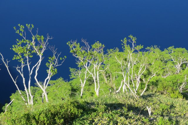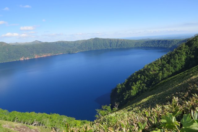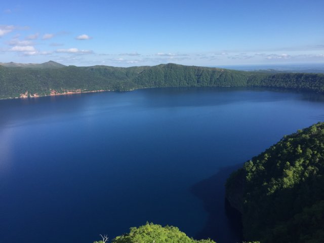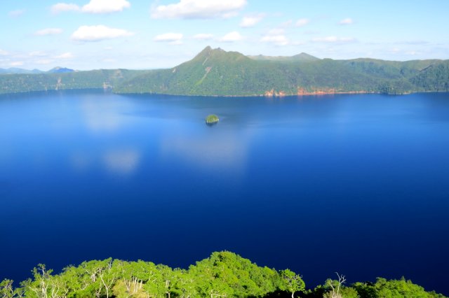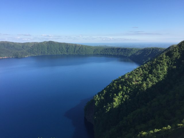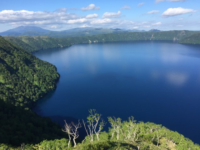 湖水の青さはまさに「摩周ブルー」。世界でも有数の透明度を誇ります。摩周湖は貧栄養湖で、植物プランクトンによる光吸収が少なく、青い湖水となります。夏場は湖水の温度も上がってプランクトンが活発になり、少し緑色になります。