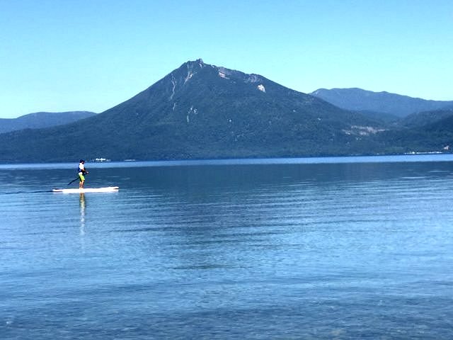 透き通った水が綺麗な湖で、千歳川ではニジマス・ヒメマスが泳いでいる。SUPやカヌー、ボートで遊ぶ人。湖畔の公園とT12年の山線鉄橋。