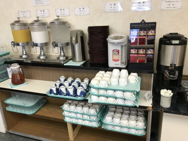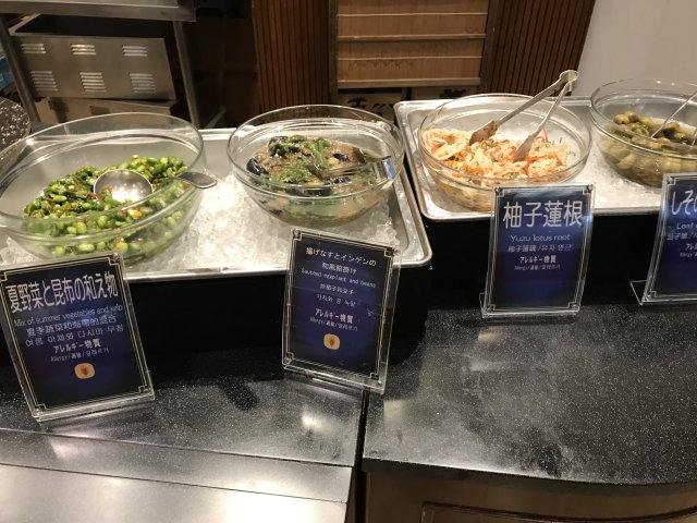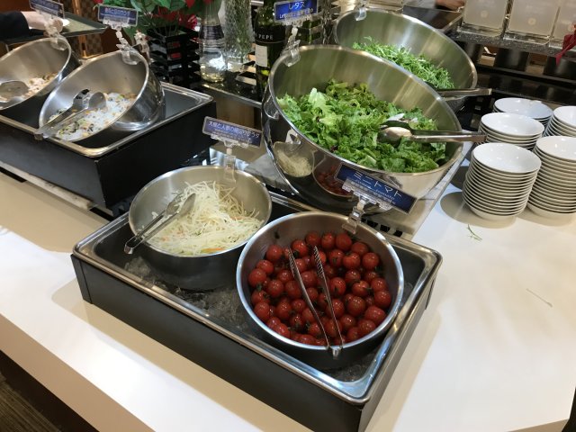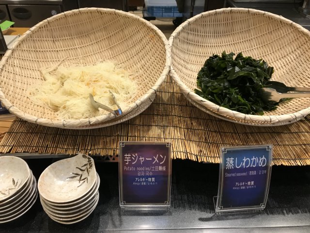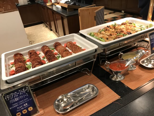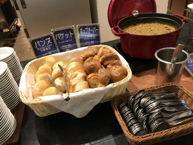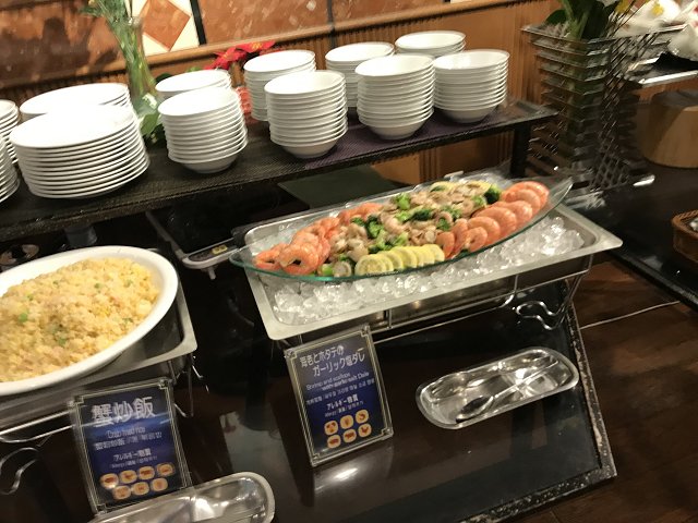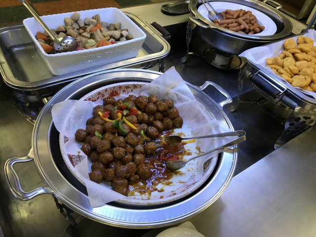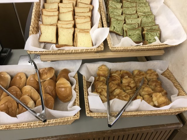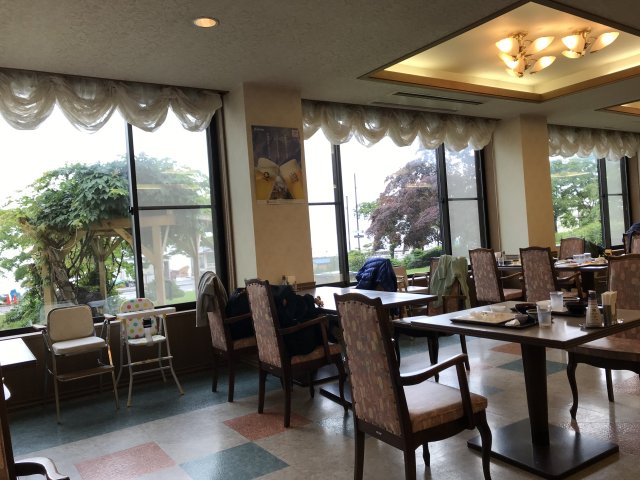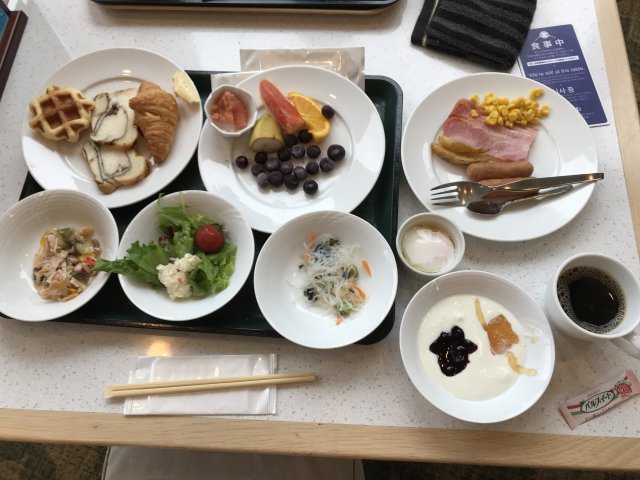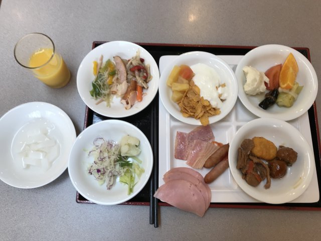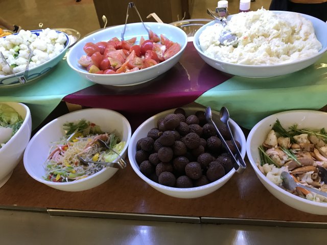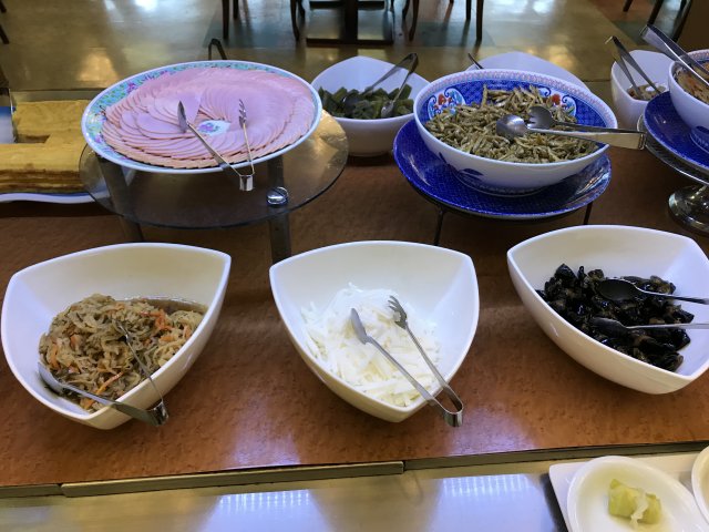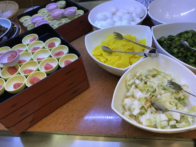 ・朝食は1Fの湖畔レストランにて。パン、サラダ、生ハム・ベーコン・ウインナー、煮つけ物、惣菜、卵、フルーツ、ジュースなど、朝は普通の感じ。