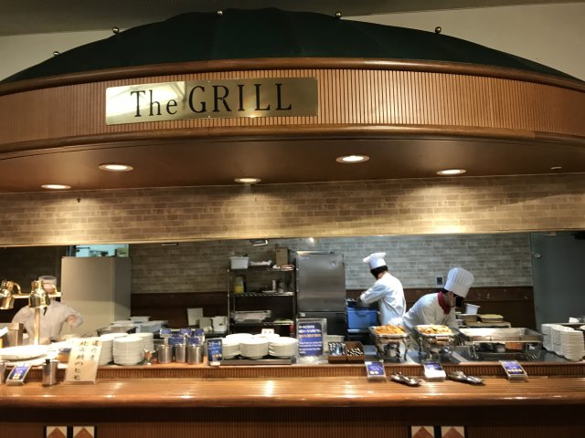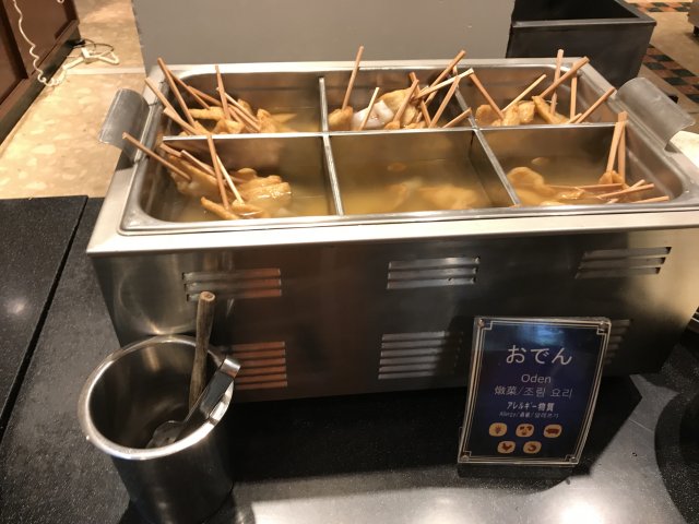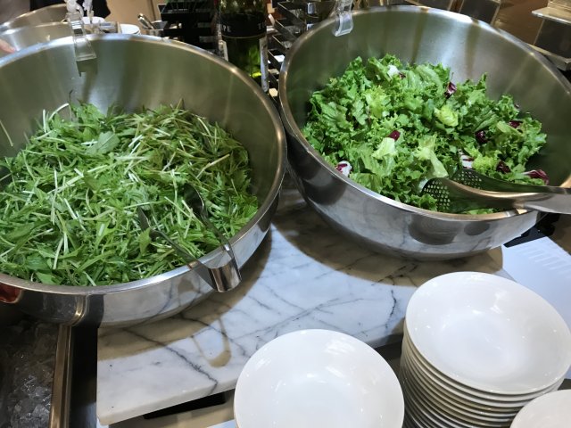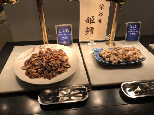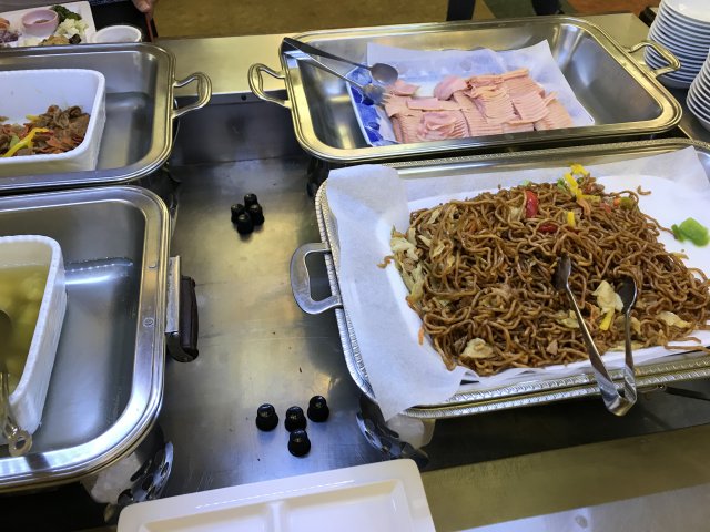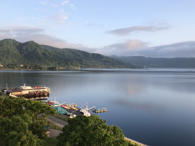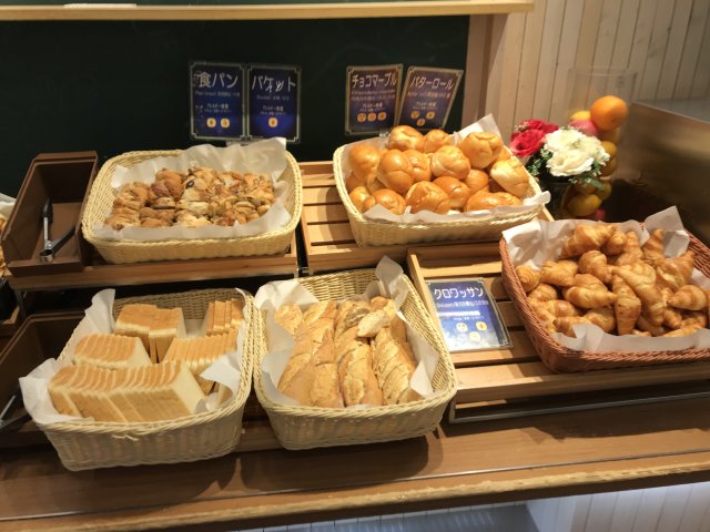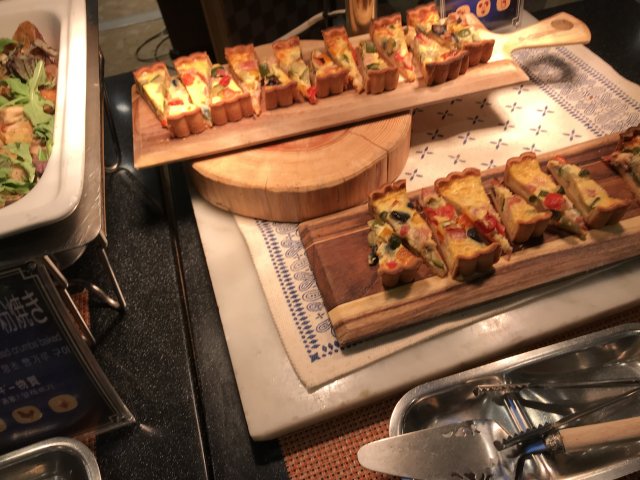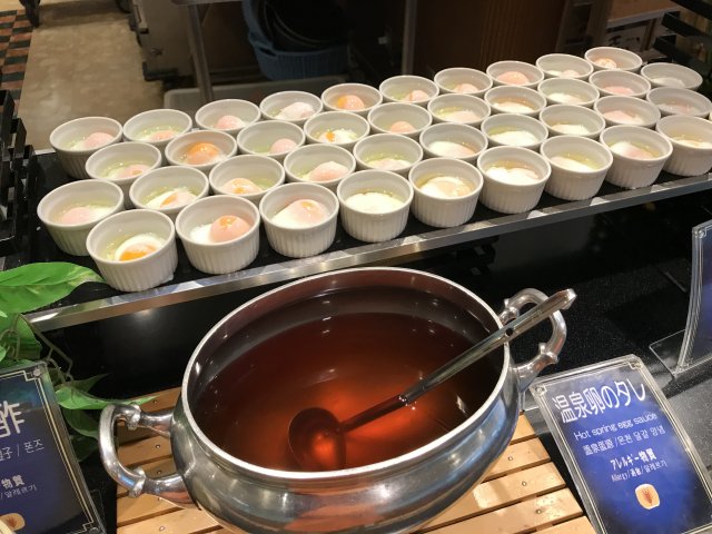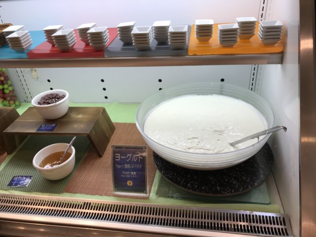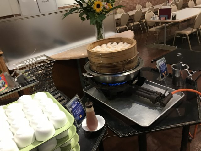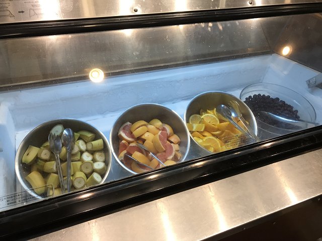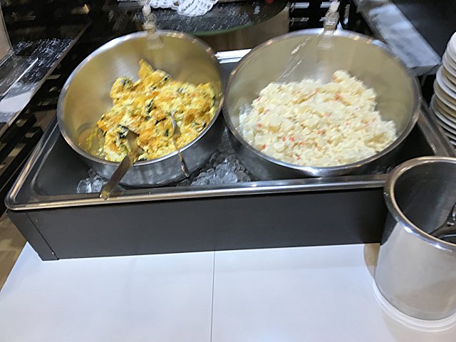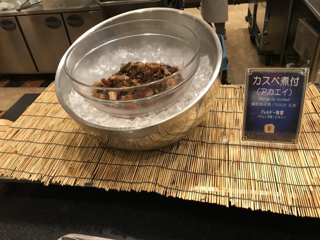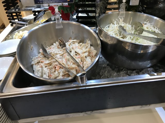 ・朝食は1Fの湖畔レストランにて。パン、サラダ、生ハム・ベーコン・ウインナー、煮つけ物、惣菜、卵、フルーツ、ジュースなど、朝は普通の感じ。