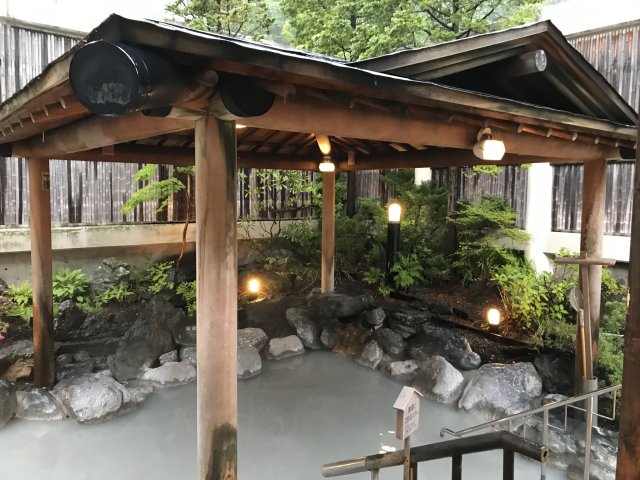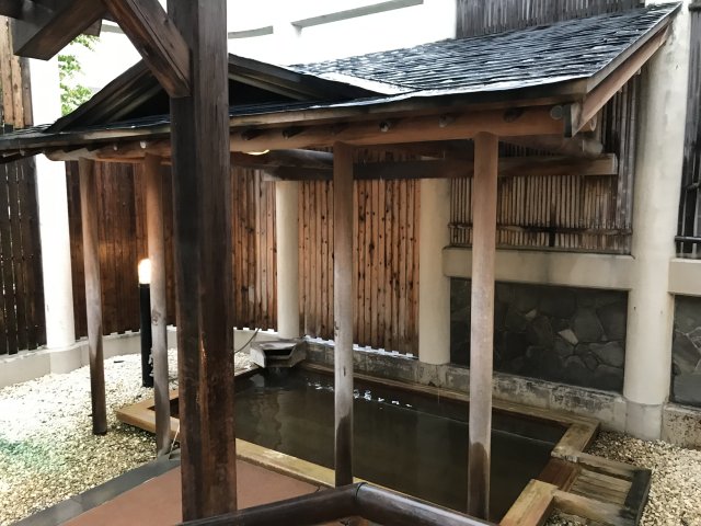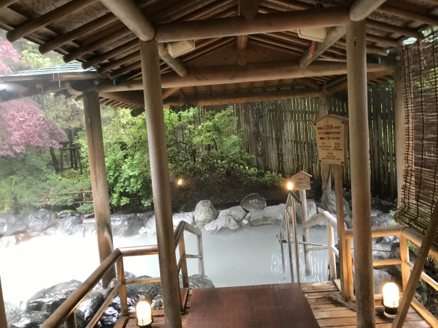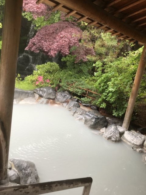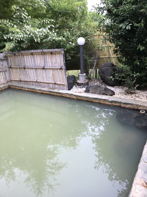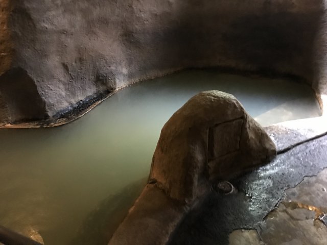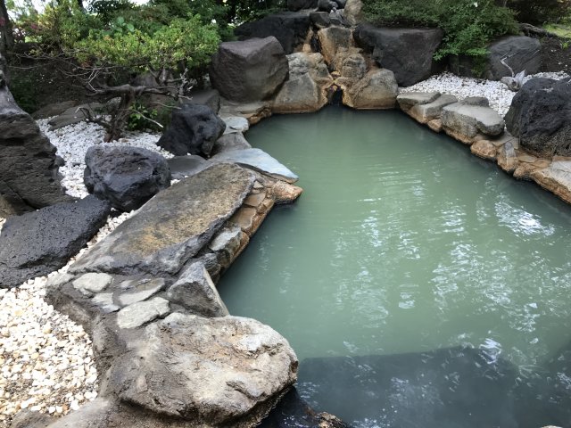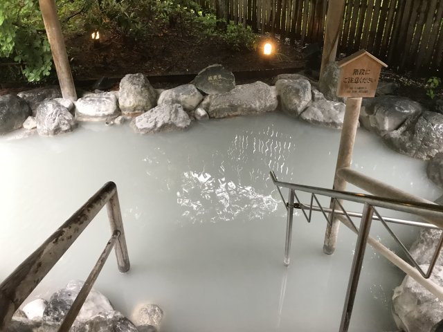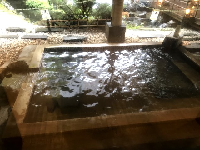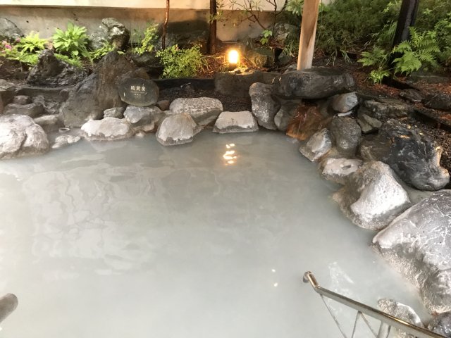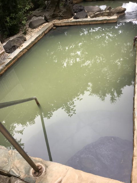 ・庭園の露天風呂で岩風呂。泉質は硫黄泉で源泉かけ流し・加水・加温。独特の匂いがする硫黄。効能は皮膚病、リューマチ、糖尿病、美肌効果など。