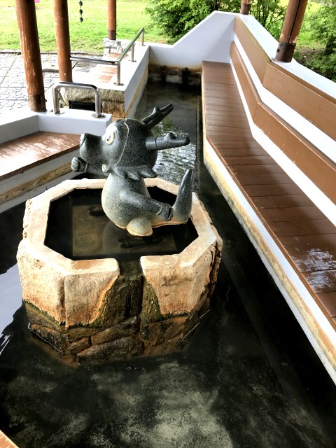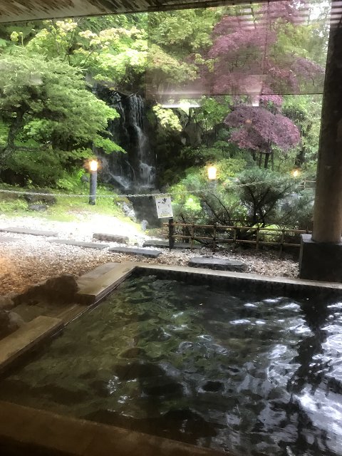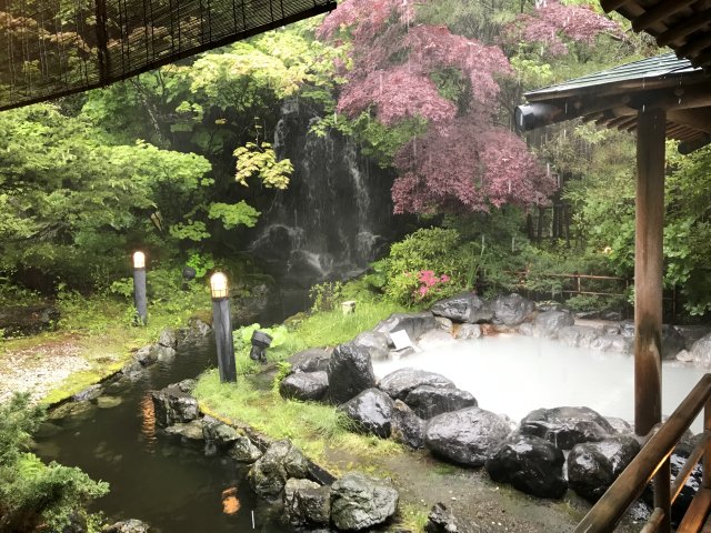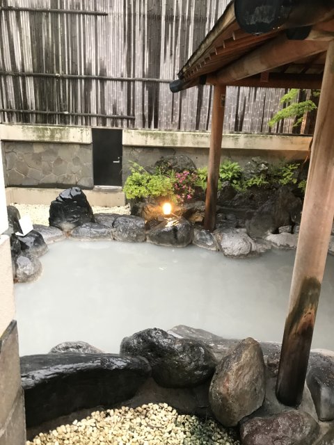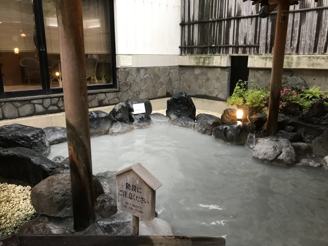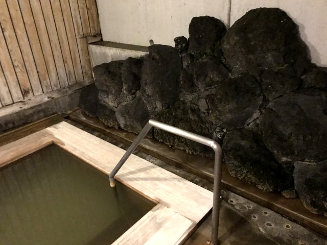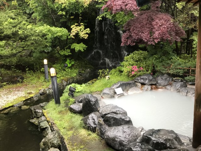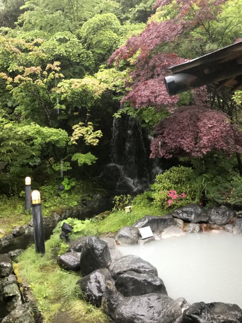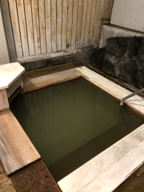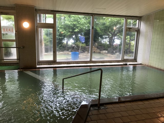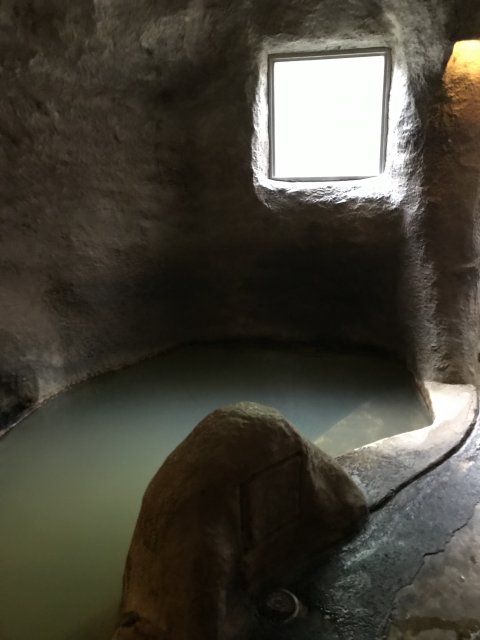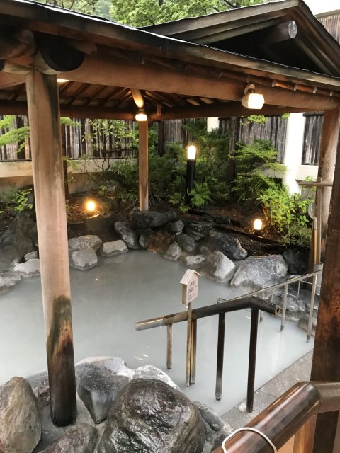 ・庭園の露天風呂で岩風呂。泉質は硫黄泉で源泉かけ流し・加水・加温。独特の匂いがする硫黄。効能は皮膚病、リューマチ、糖尿病、美肌効果など。