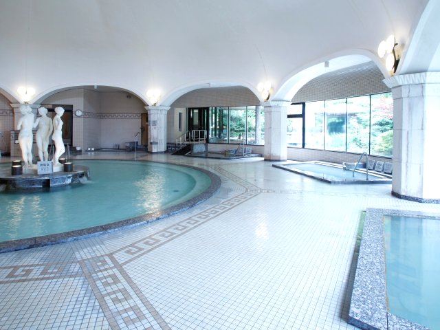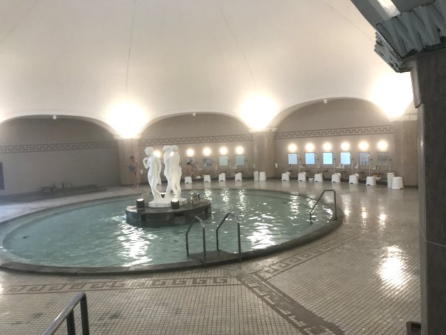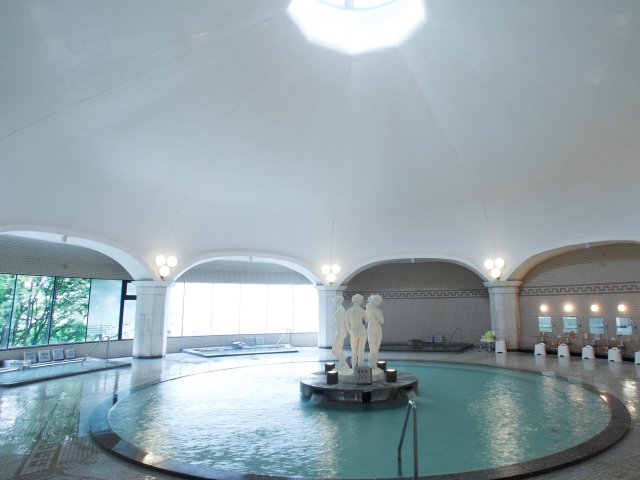 1)日本でも珍しい本格ドーム型ローマ風の大浴場。1938年創業。とても広い円形の湯舟で温泉というよりもクワハウス・プールのよう。湯は食塩泉で循環ろ過・加水・加温・塩素薬剤使用。こんなに広いのに温泉客は1人もいなかった。