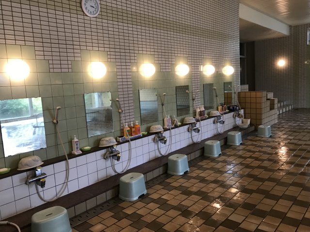 2)大きな湯船の周りに3つの小さな湯船があり、硫黄泉、食塩泉、鉄泉と異なる湯が楽しめる。鉄泉は源泉かけ流し・加水。