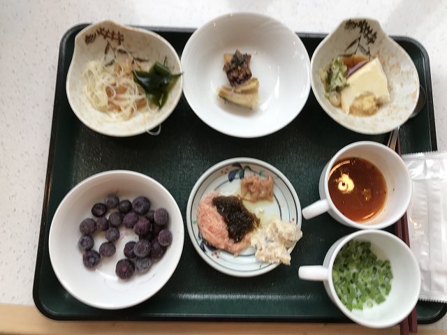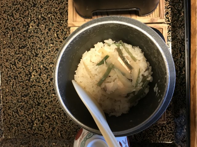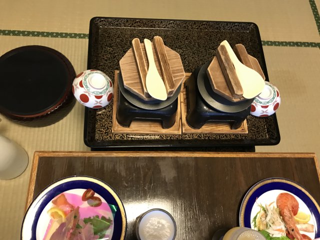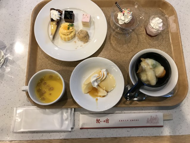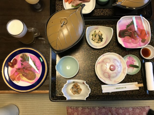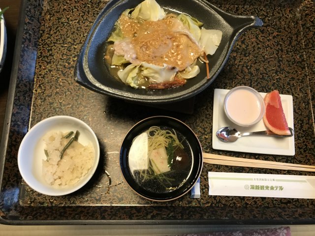 ・夕食は部屋でゆっくりと食事。予想していたものよりはボリューム満点。刺身、ボタンエビ、味噌肉野菜炒め、お吸い物、炊き込みご飯。ヨーグルト、グレープなど。