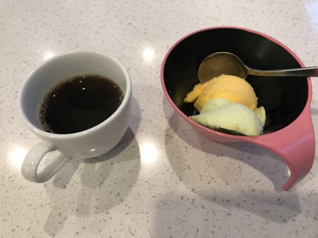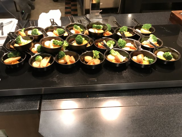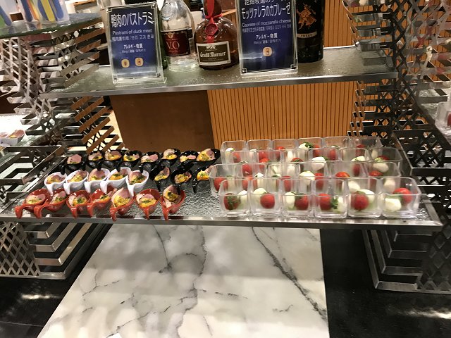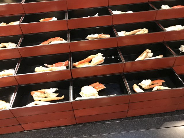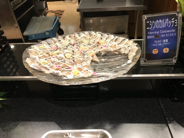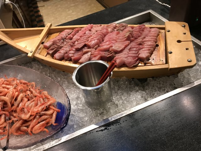 夕食はマグロ、タコ、イカなどの刺身、カニ、エビ、天ぷら、ビーフシチュー、ラクレットチーズなど。焼き立てのステーキはとても柔らかく、どの料理もおいしかった。天ぷらが少し冷めていたのが残念。