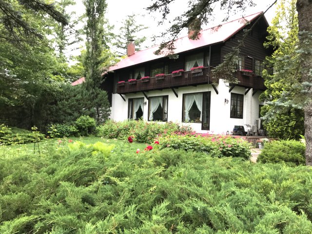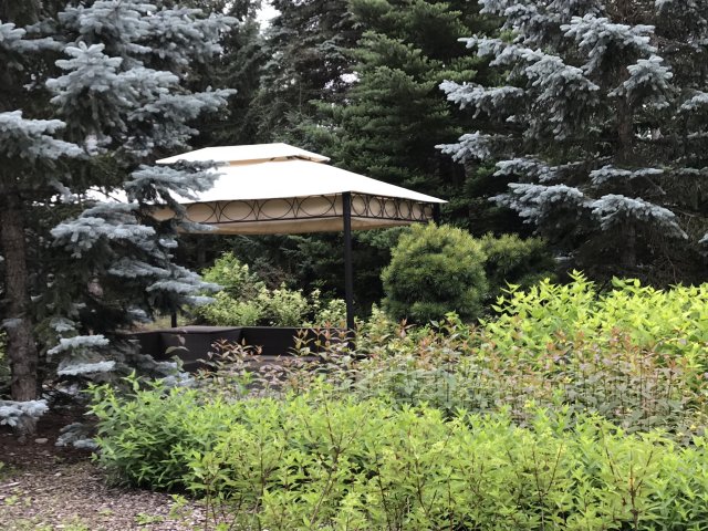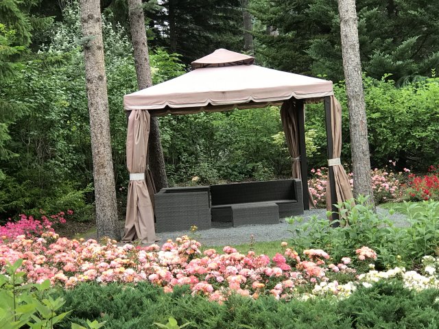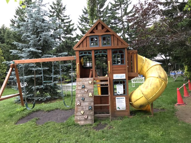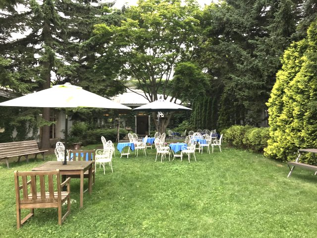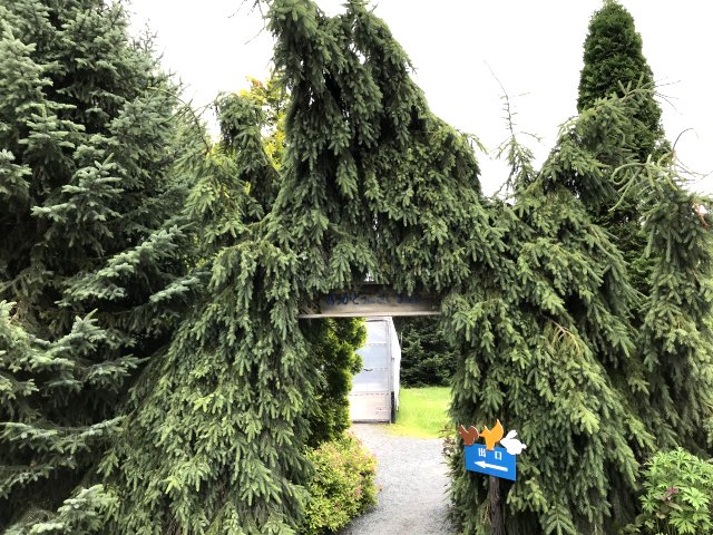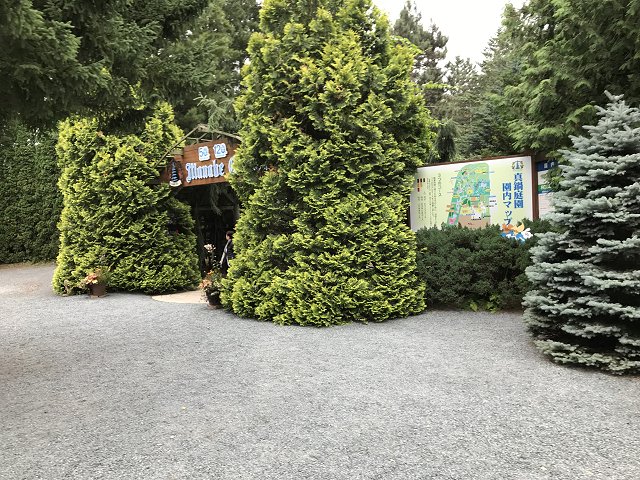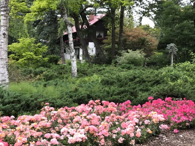 樹齢1000年を越すエゾマツやトドマツなどの巨木の他、北欧やカナダから輸入された針葉樹が生い茂っています。赤い屋根の家がシンボルで、1977年建造のチロルハウス風の建物。バラの生い茂るガゼボで休憩して庭園を