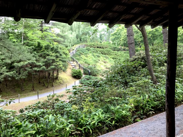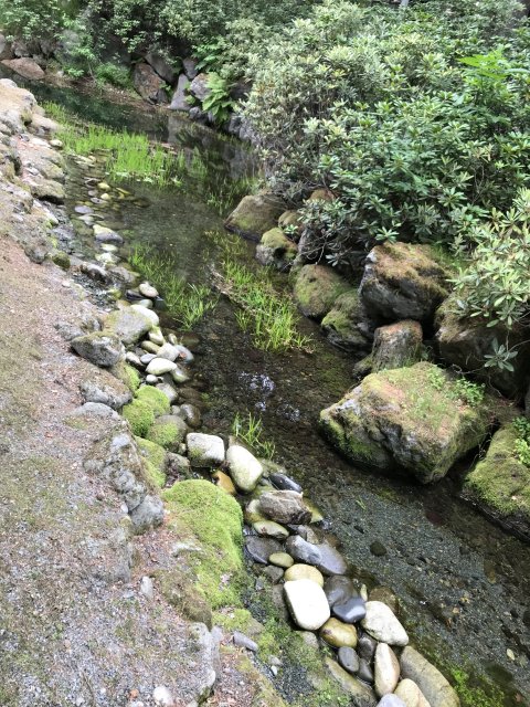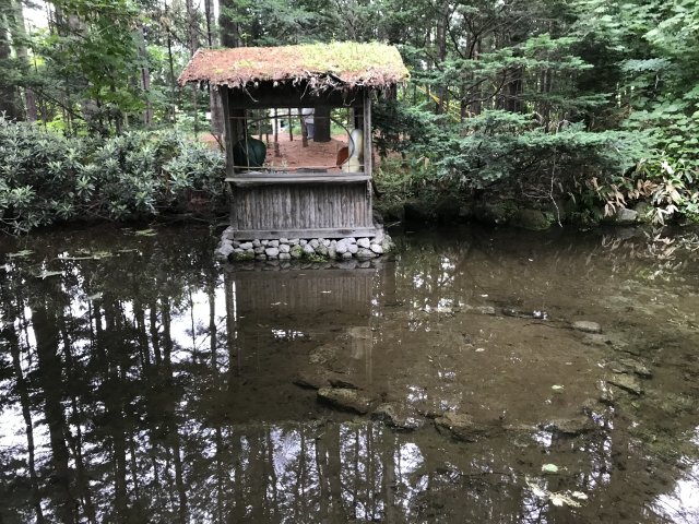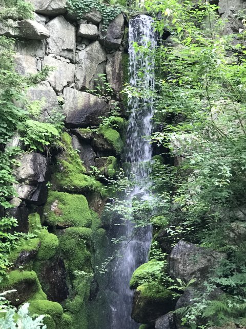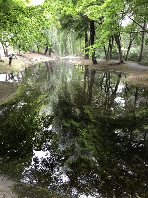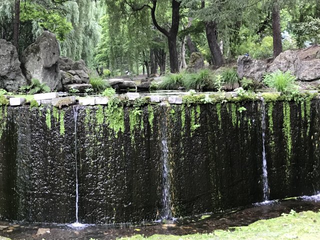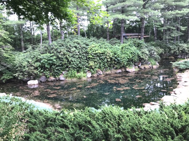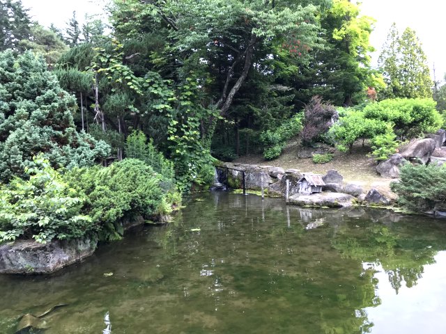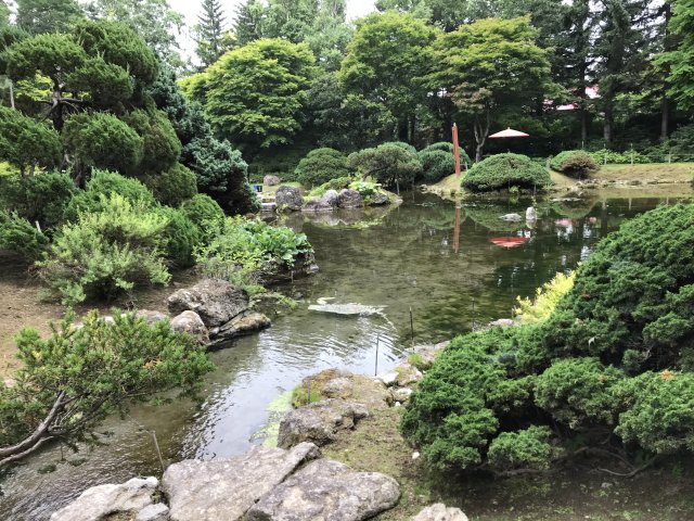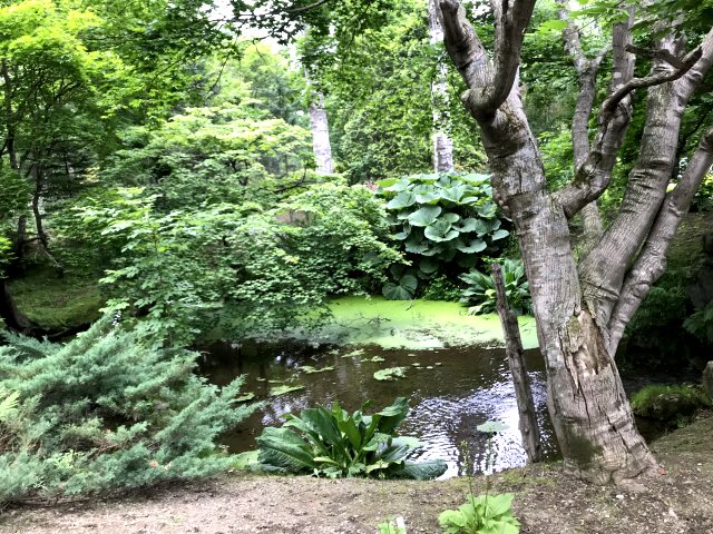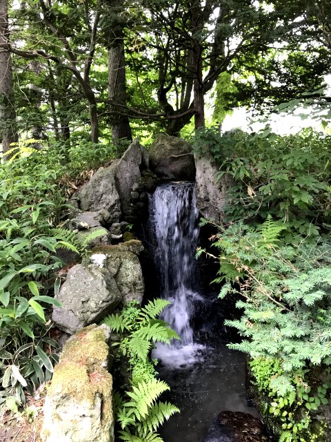 展望デッキ、滝、池、小川、教会、はまなすの丘、ストローブマツの森などいろいろある広い庭園。庭園には地形に高低差をつけて滝や小川や池があり、手入れされた庭園です。風景式庭園は当時の原始林を思わせる森林を