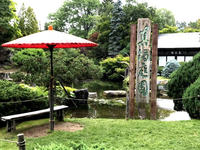 真鍋庭園は帯広駅から15分、とかち帯広空港から20分、帯広広尾道の帯広川西I.Cより5分。(8:30-17:30,\1000/入園料,P30)