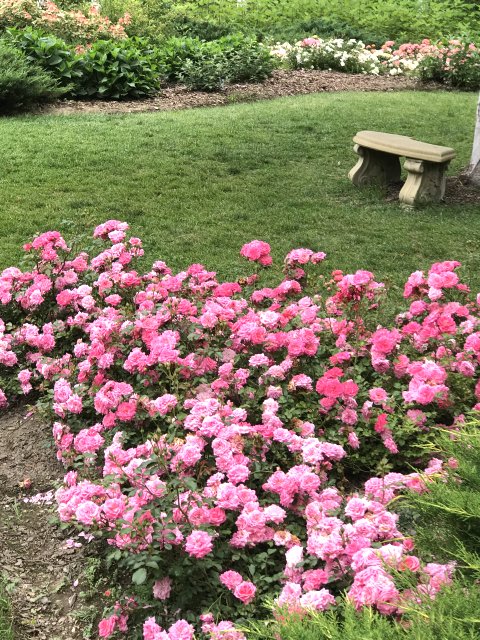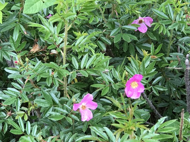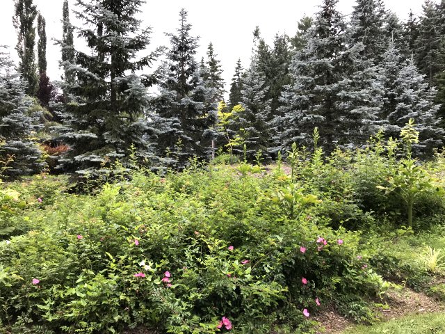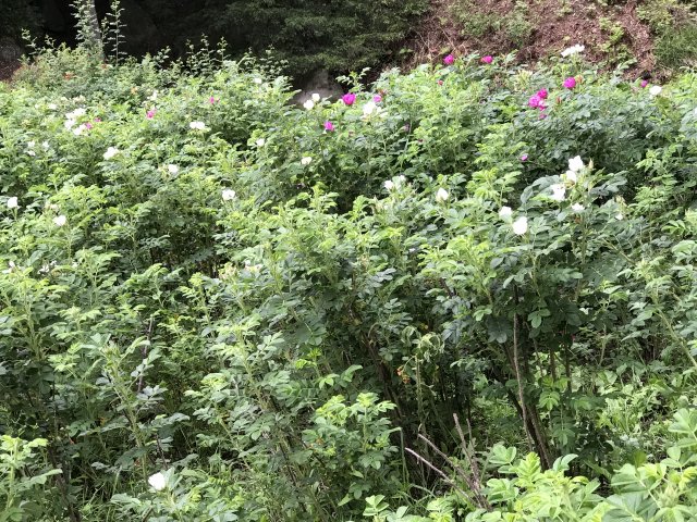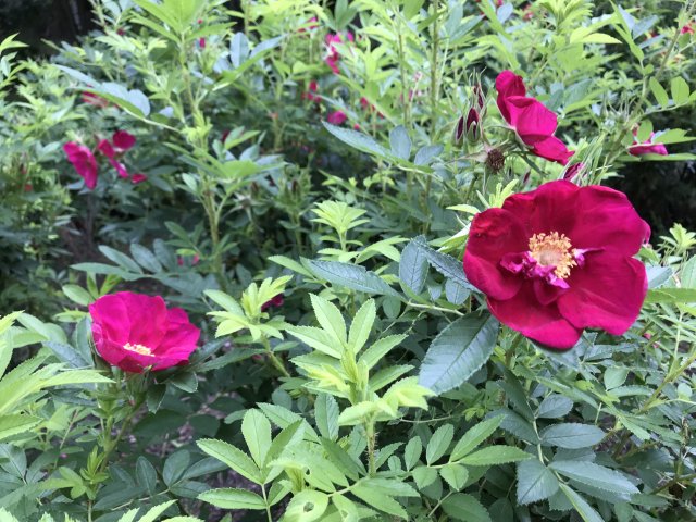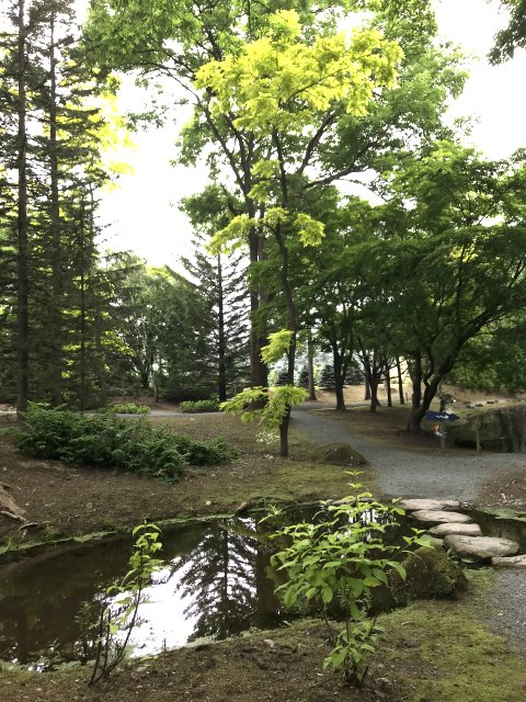 背景に寒冷地に耐えうる樹木や外国産特殊な樹木が植えられ、林の中の池には湖面に木々が映り込んで幻想的。途中の休憩所で庭園を眺めながら休むのもよい。奥の丘には赤と白色のハマナスが盛りでした。林の中には
