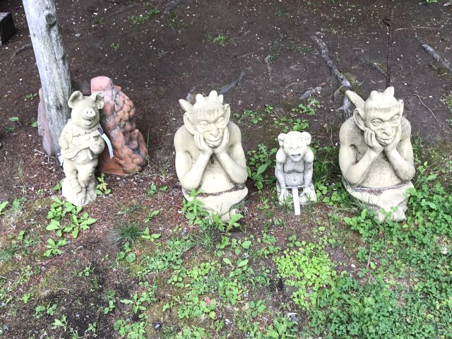 アマエビなどの木彫。他にも不思議な木のオブジェ?。