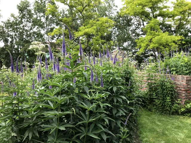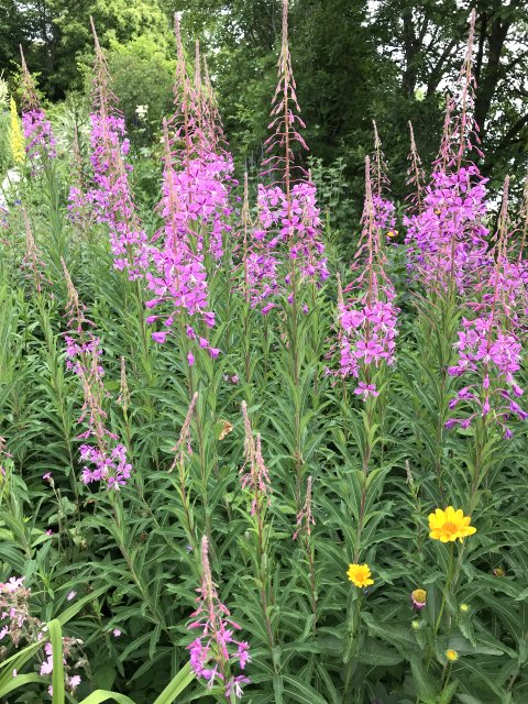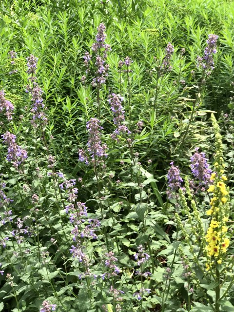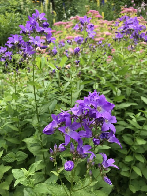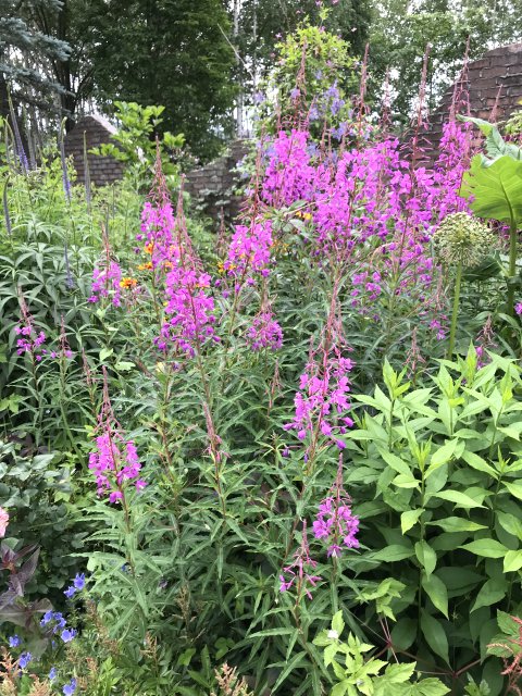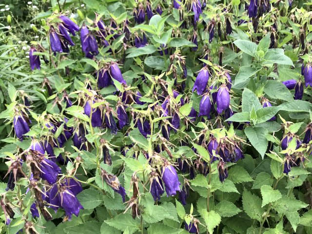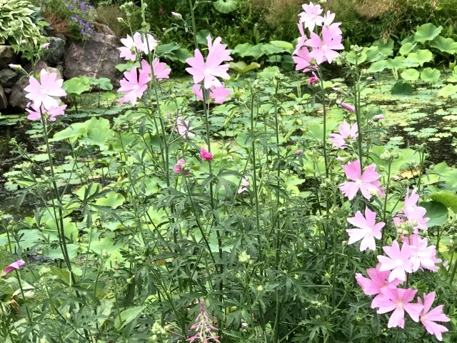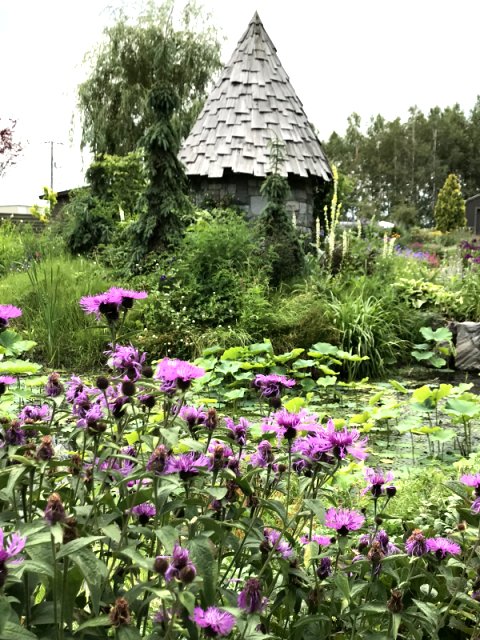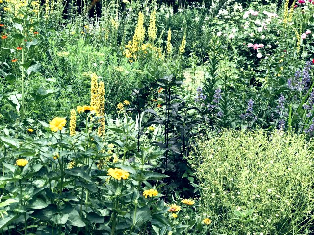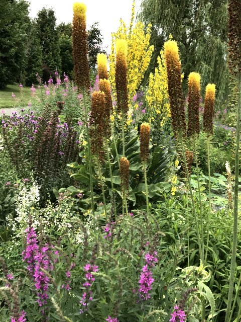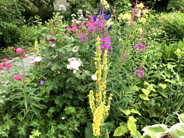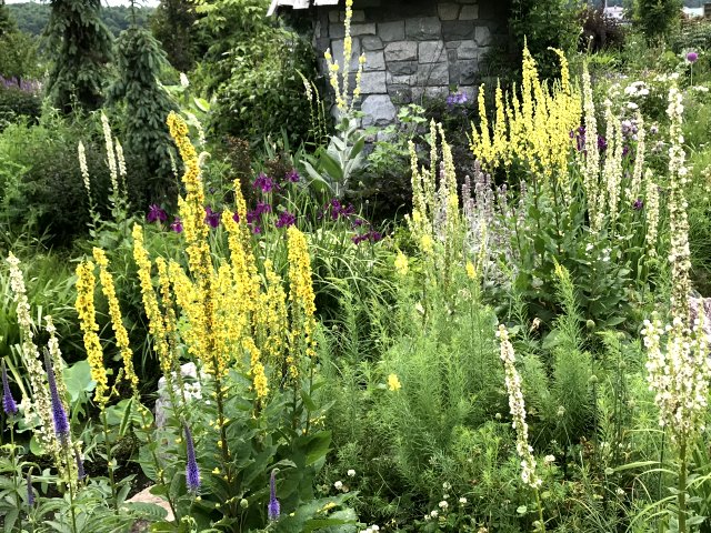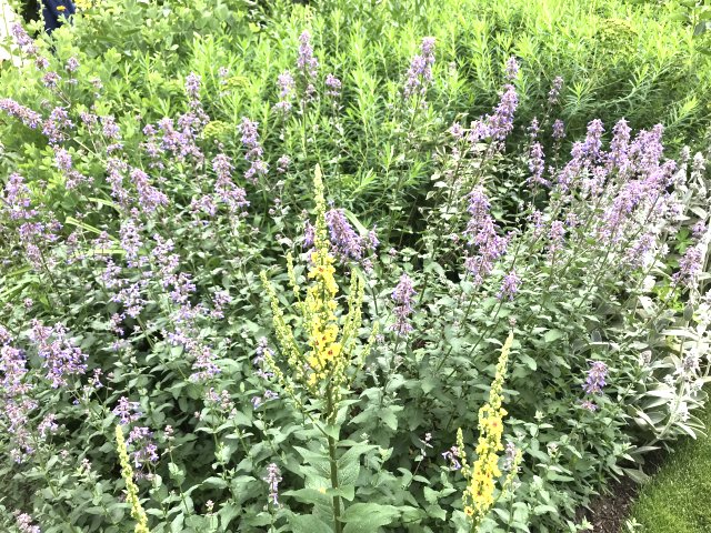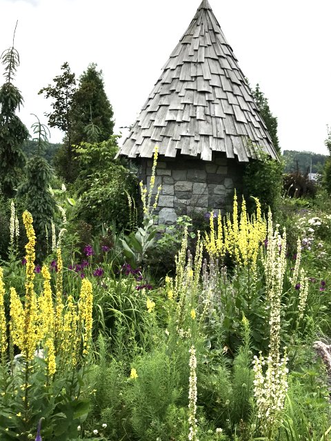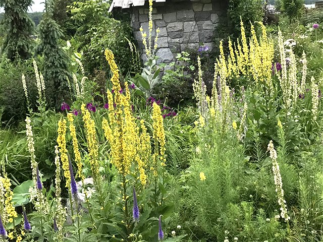 ユリ、バーバスカム、カンパニュラ、フロックス、ホリホック、ヘリオプシス、アンジェリカなど色々な花が見られます。ハーブの葉はありますが、ラベンダーは殆ど見かけません。たくさんの山野草があり、初めて見る花も数多くありました。
