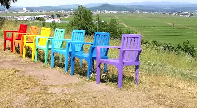 自然な草花が植えられ、丘の上からは上川盆地の田園風景を眺められます。虹色のカラフルなイスが並んでいます。青空が広がっていればステキでしょう。