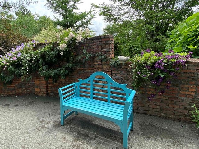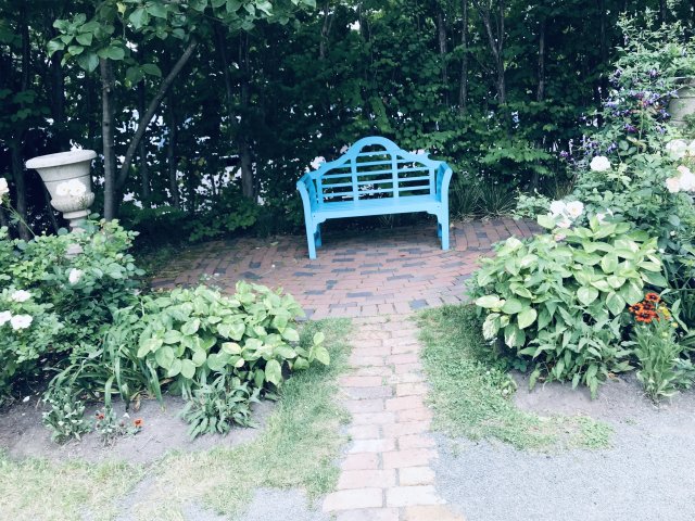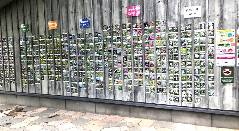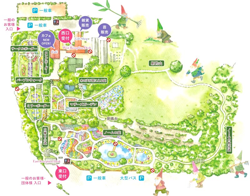 園内には花の看板があり、色別に多くの花の名前と花の写真が飾られています。園内にはベンチやイスが各所に置かれ、休憩しながら花をめでるのもよさそう。また、園内にはいろいろなところにノームが隠れています。夏には開花した宿根草も