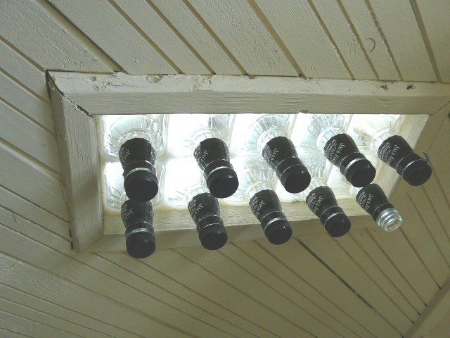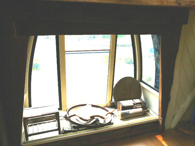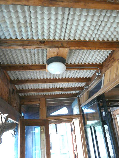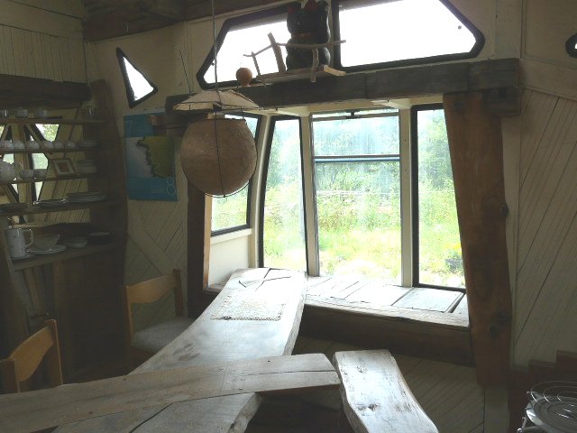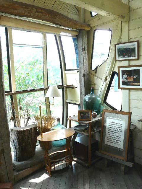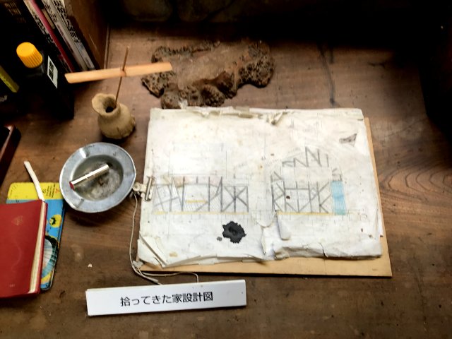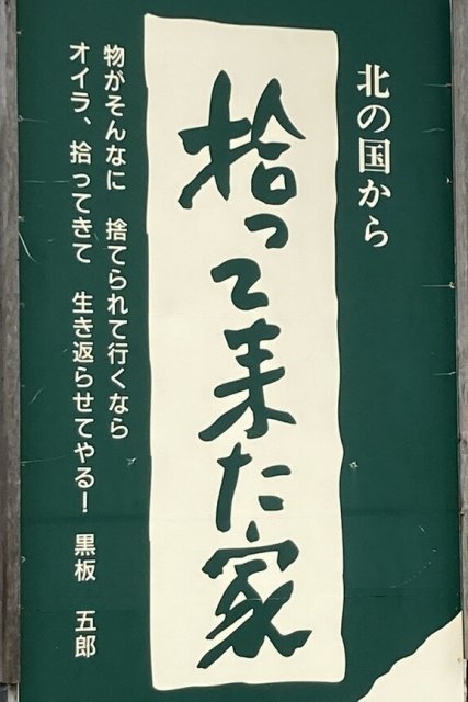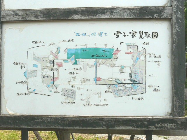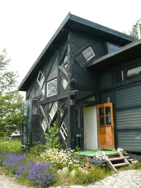 5)「拾ってきた家」;黒板五郎が廃材を集めて作った家。五郎が雪子のために作った家。トラック荷台、冷蔵庫の扉、電話ボックス、スキーゴンドラ、小窓にウィスキー空瓶、自動車窓ガラス、天井に卵パック、キッチンはワインコルクなどの