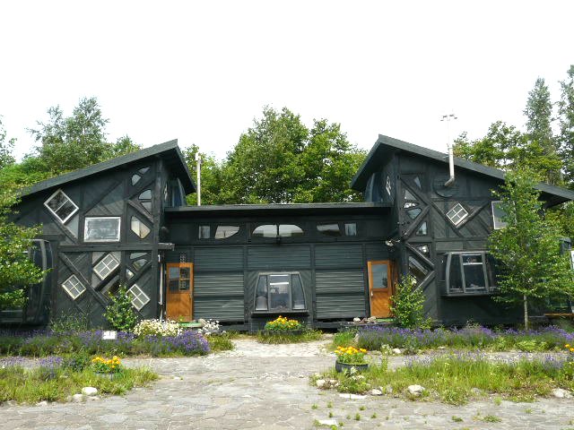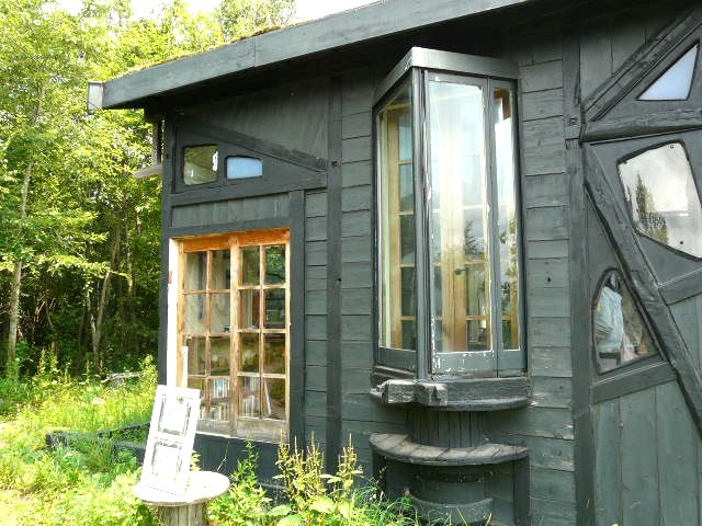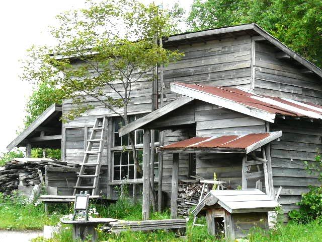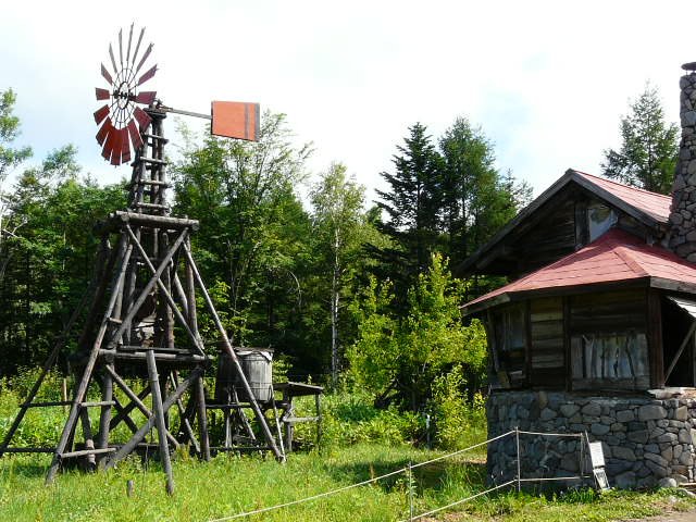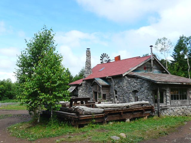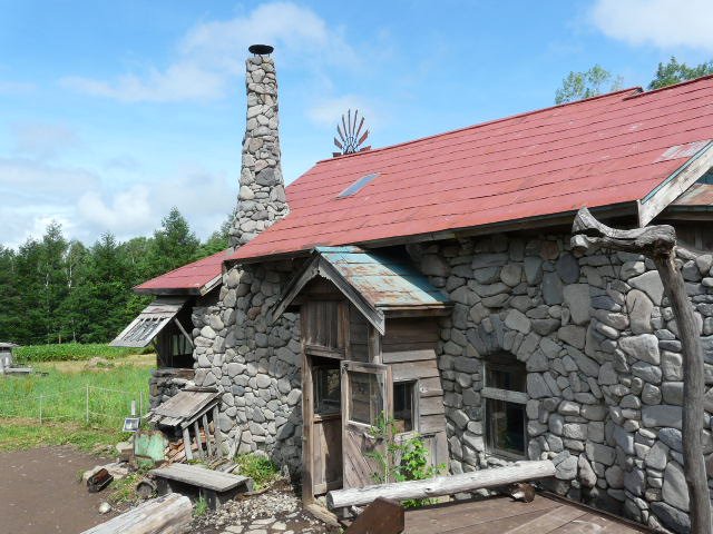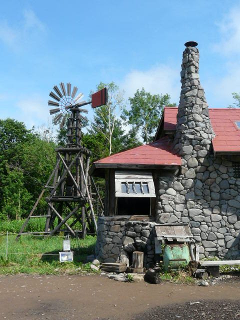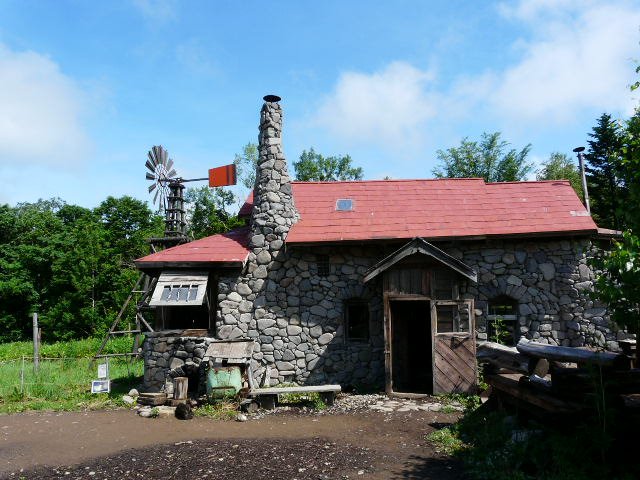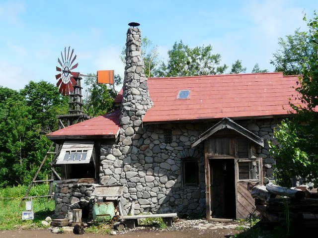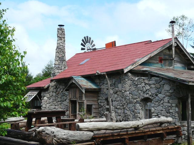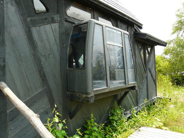 4)「3番目の家」(麓郷の森);丸太小屋が燃えた後に住んだ3番目の家。屋根に風力発電が見える。3番目の家は老朽化が激しく立入禁止。