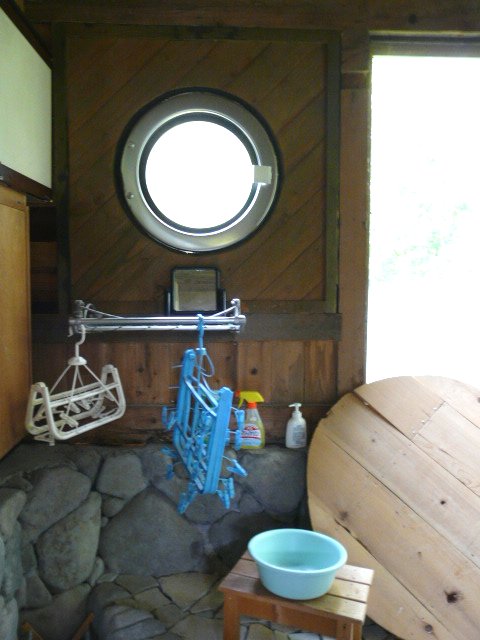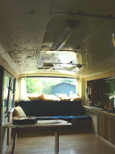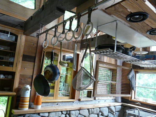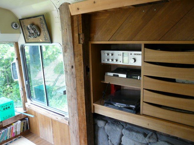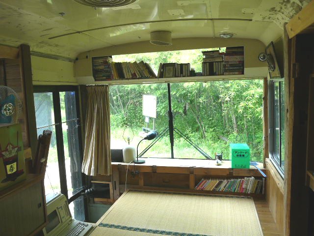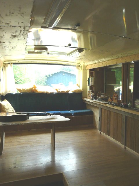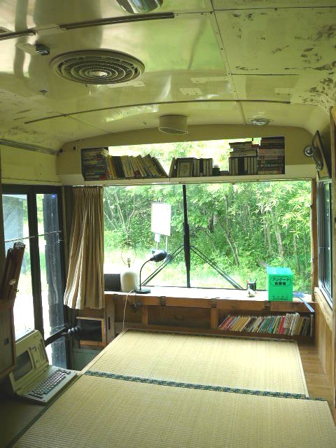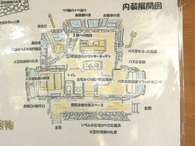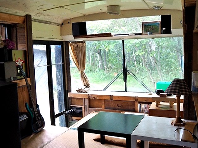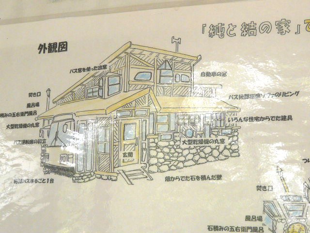 7)「純と結の家」;バスがベースとなった家。バスの吊り輪、扉、運転席、バスの窓、椅子を使ったソファーなどを利用。五右衛門風呂あり。