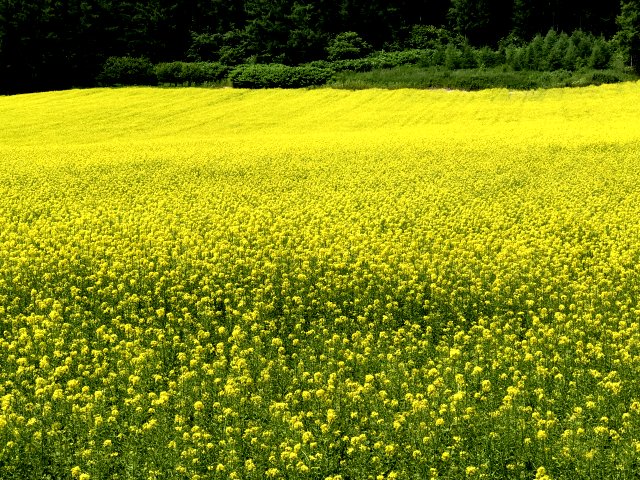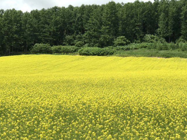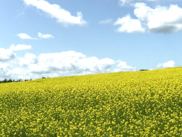 富良野の六花亭カンパーナ近くに小高い丘があり、丘一面に咲く菜の花畑がきれい。丘の上の右奥にはカフェ「Furano さくらの」があります。