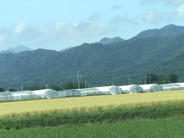 山部地区は富良野メロンの産地で「ふらのメロン街道」(北海道ガーデン街道の一部)と呼ばれ、あちらこちらに大型のビニールハウスが立ち並んでいます。富良野は夏は天気が変わりやすく、ビニールを開閉して温度や水を調整するそうです。