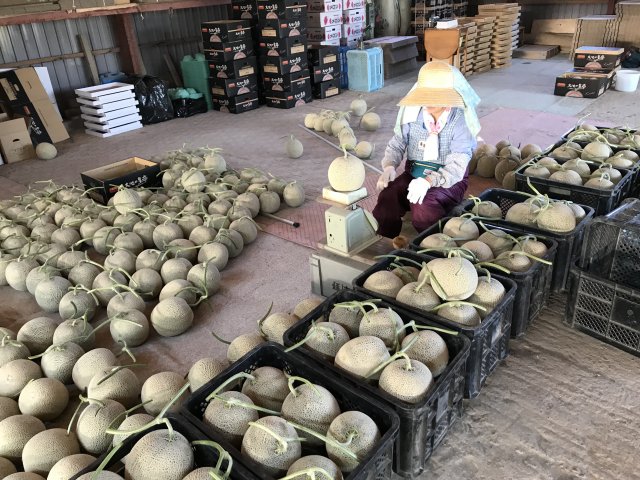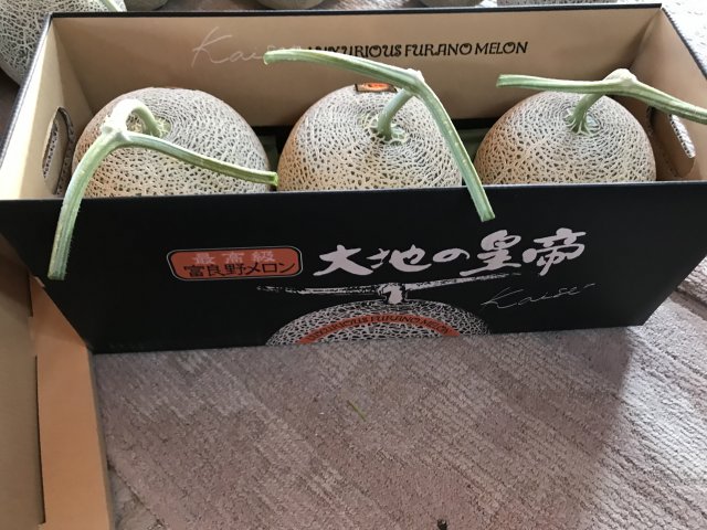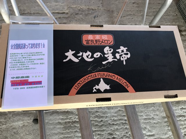 切ってたくさんのカットを食べさせてくれます。採れたてはみずみずしく甘くて、とてもおいしいかった。JAふらのに出荷作業中でしたがメロンを購入、まけてもらいました。(中玉1.6kg;\8100→\6500/3個)