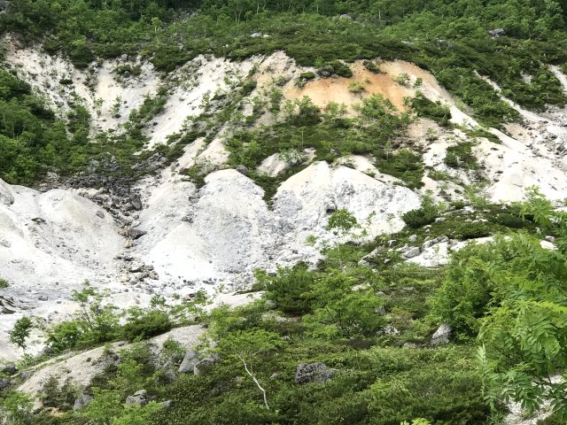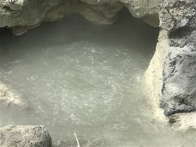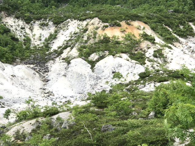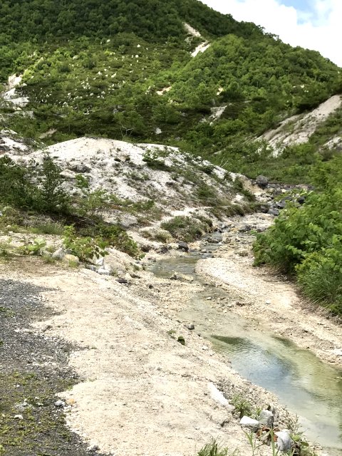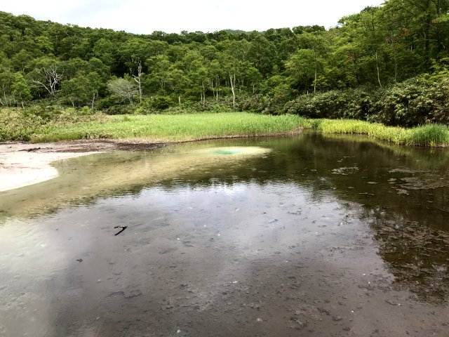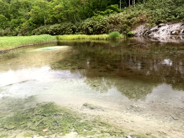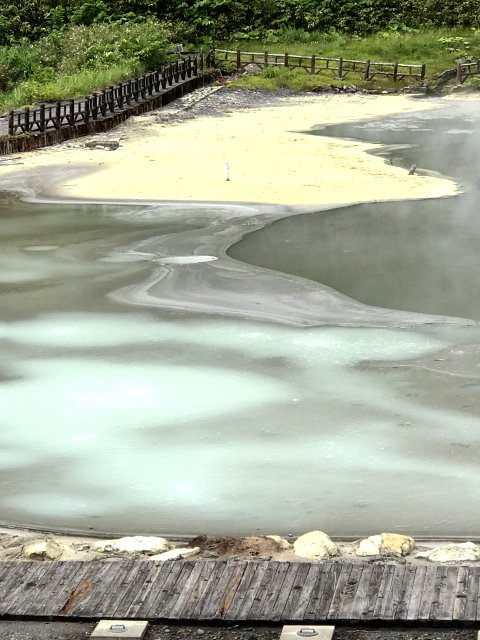 沼底からは二酸化硫黄を含む約120℃の高温ガスが噴気し、湯面には気泡が見え、沼からぶつぶつと温泉が湧き出しています。沼の温度は40℃、中心部で60-80℃。辺りは白い湯気が漂って硫黄の匂いがかなり強い。湯ノ花の黄色球硫黄が