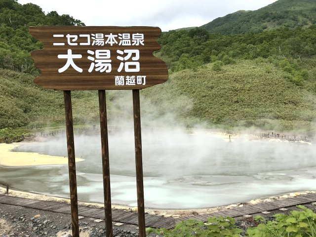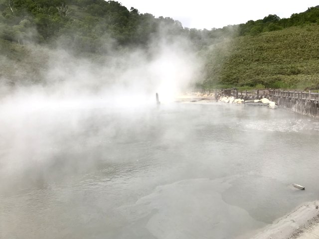 ■蘭越町にある「大湯沼」(標高560m)は、温泉の泥沼で「ニセコ湯本温泉」の源泉です。沼の周囲は約200m、縦50m・横90mの沼。湯量は毎分1000L。