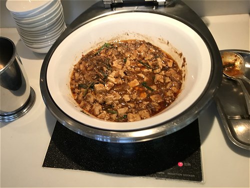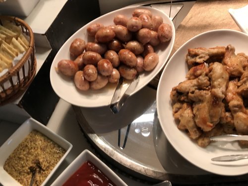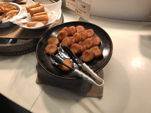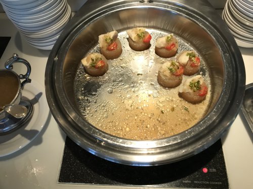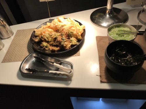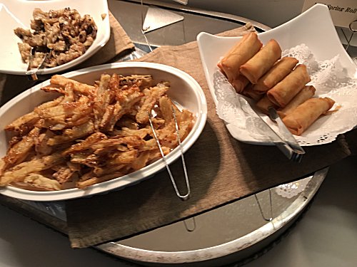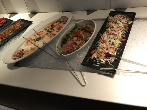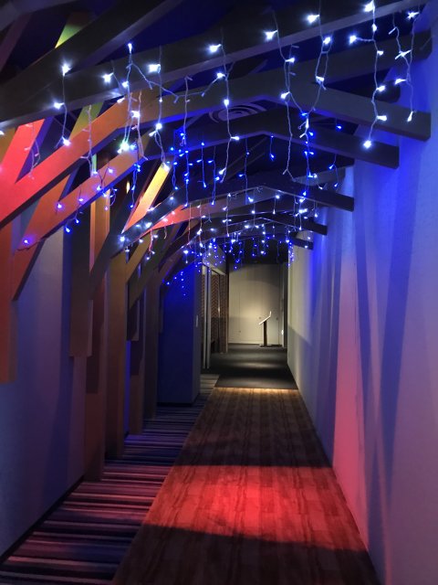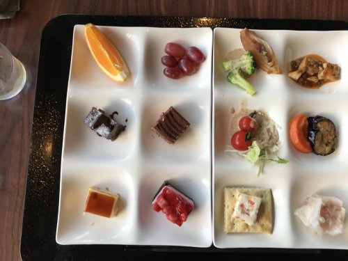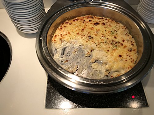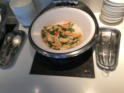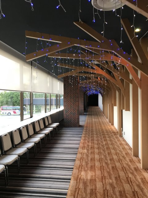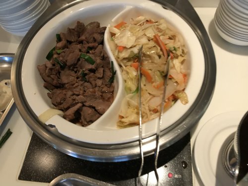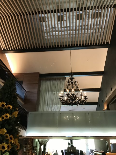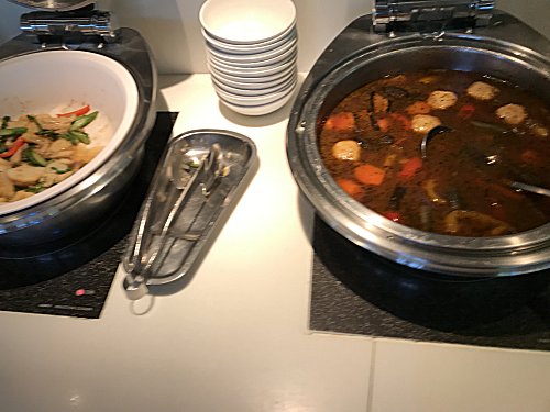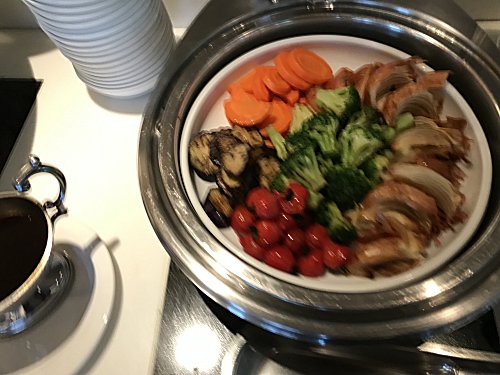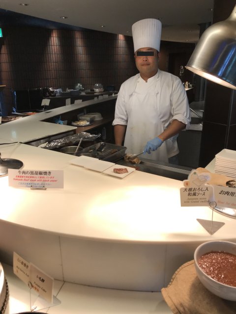 シェフが焼き上げるステーキは美味しかった。朝・夕食はバイキングで料理の種類はまずまず。朝は新鮮な野菜サラダと焼き立てパンが美味しい。レストランへの通路はライトアップ。