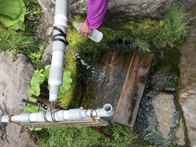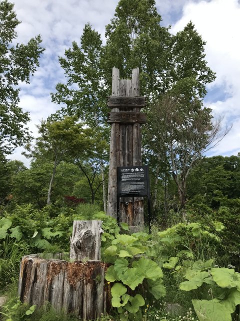 丸太を組んだ水飲み場から湧き出る水は冷たくてまろやかで美味しい。空いていたペットボトルに水を汲んで持ち帰りました。水を汲みに来る人がたくさんいました。