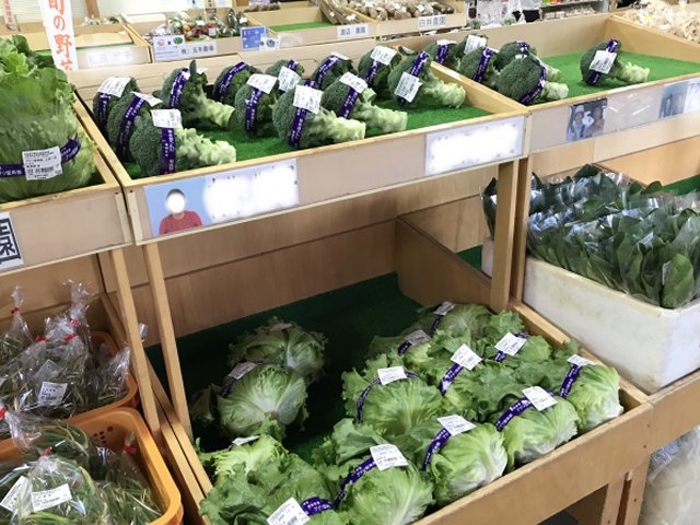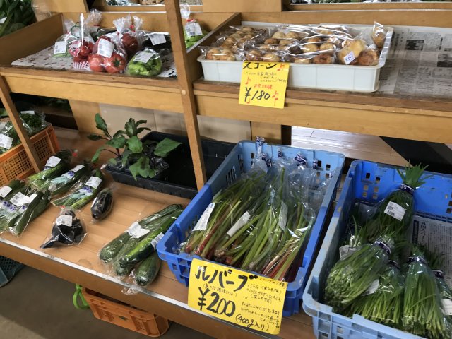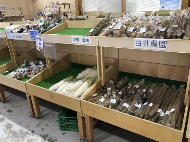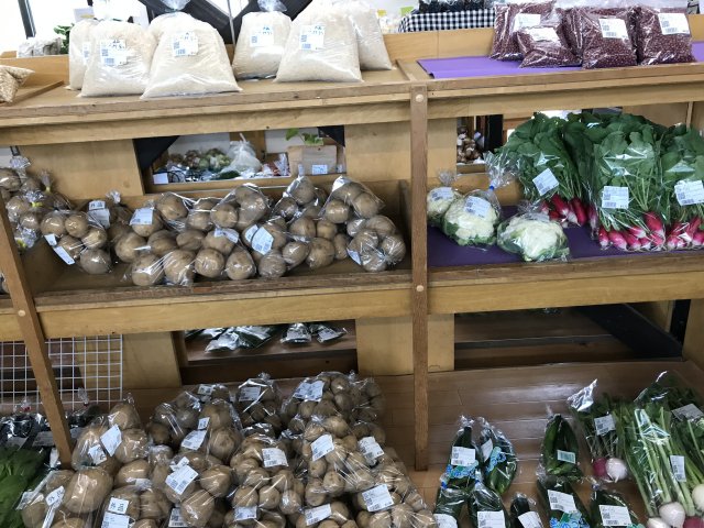 農林水産物直売所では留寿都でとれた新鮮なレタスやブロッコリー、葉物、グリーンアスパラ、ゴボウ、じゃが、ダイコン、豆類、花など種類が豊富。