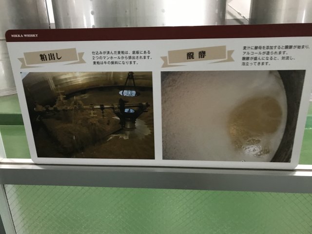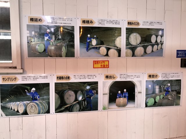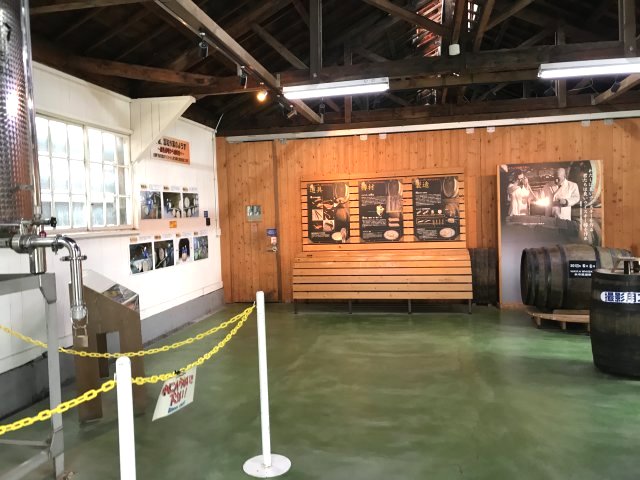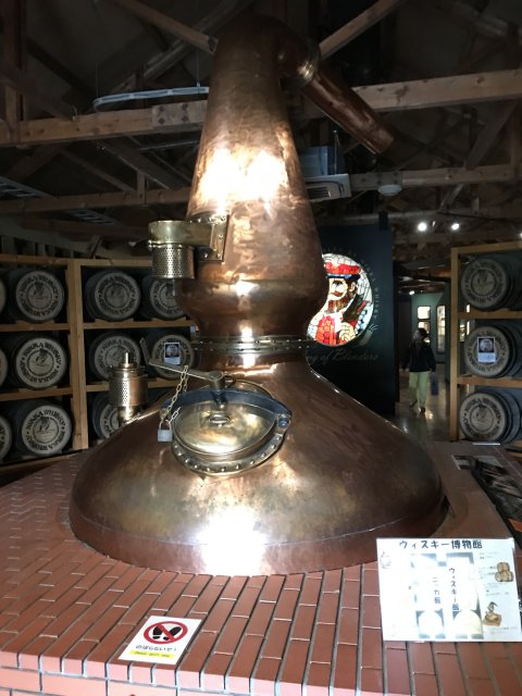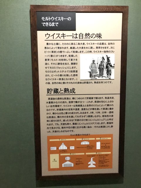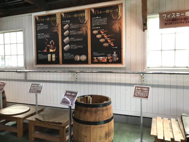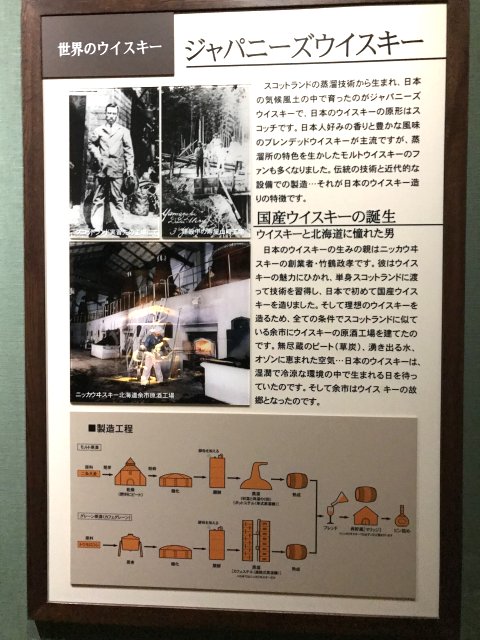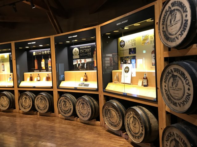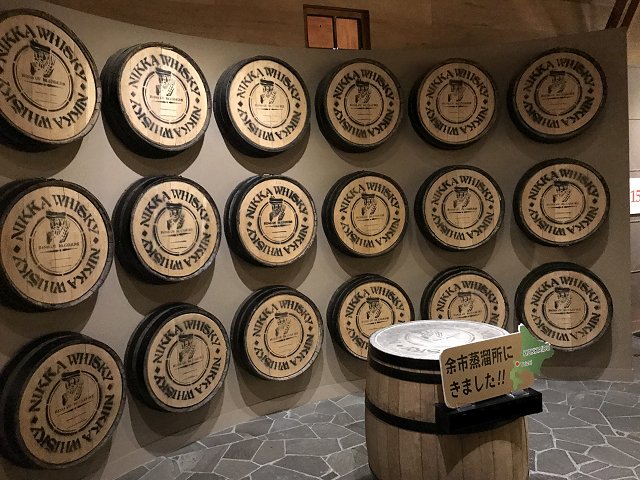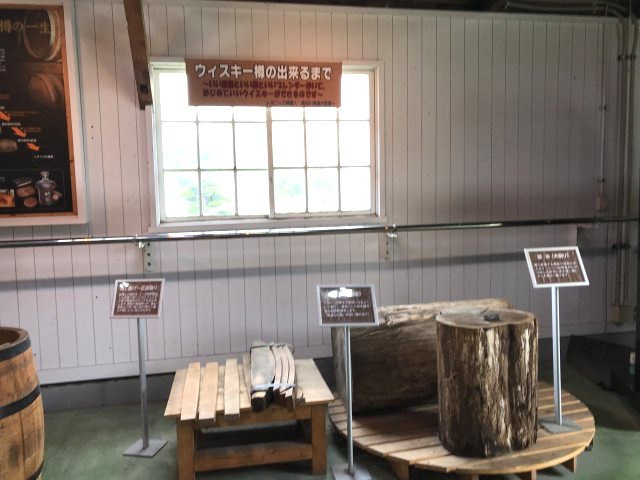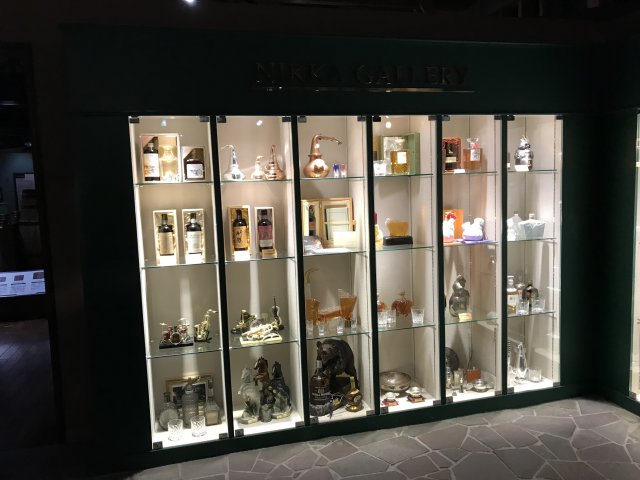 4)ニッカミュージアム(旧ウイスキー博物館);ウイスキーづくりの紹介、ニッカウヰスキー創業者・竹鶴政孝の歩みと歴史、商品展示、有料テイスティング・バーなど。※写真は旧博物館の展示物。