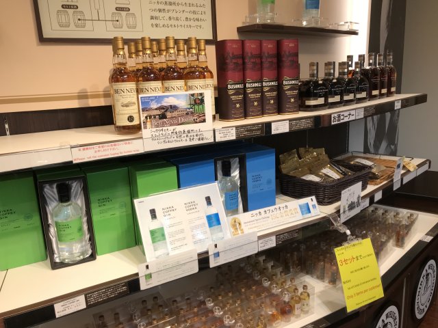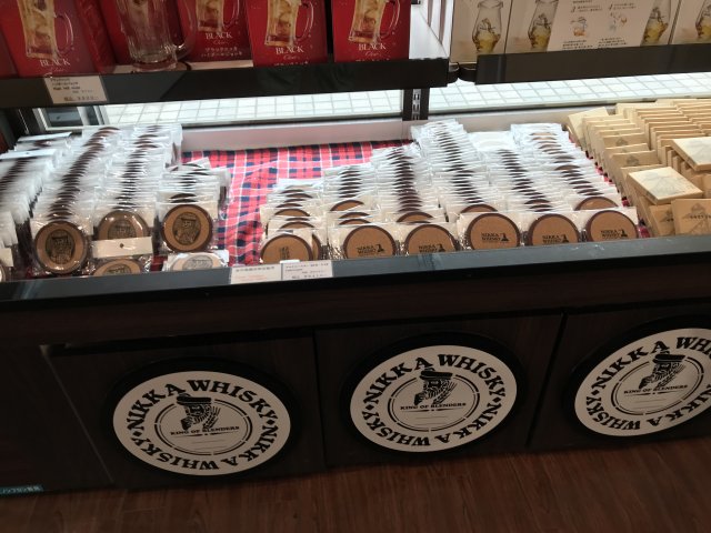 6)売店「ノースランド」;シングルモルト余市などのニッカウヰスキー商品、ジョッキ、グラス、コースターなどのグッス、チョコお菓子・つまみなど、お土産を販売。