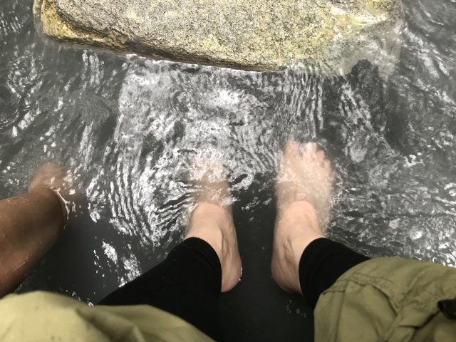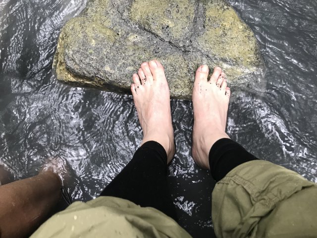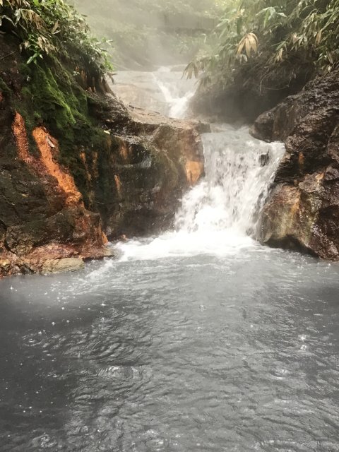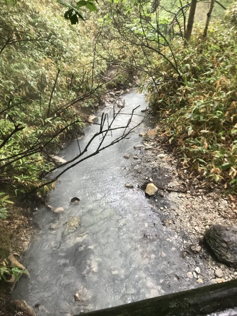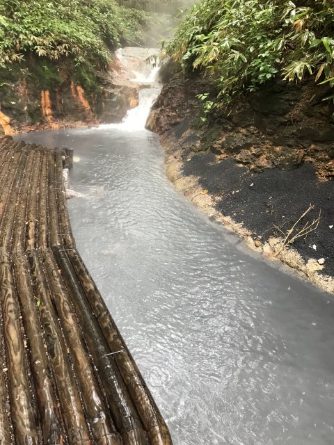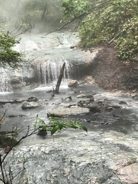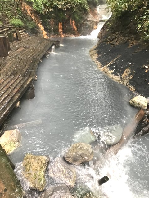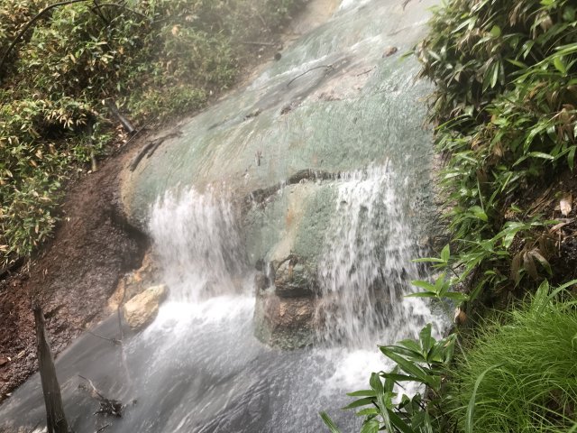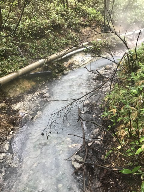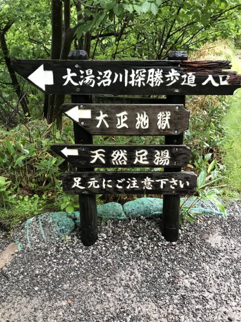 道路脇から原生林の中にある散策路を下ります。足湯へ向かう途中に3-4分で「大正地獄」あり。周囲10mの湯沼で大正時代に起こった小爆発によってできた。湯泥が噴出するため立入禁止。「大正地獄」から4-5分で天然足湯に着きます。