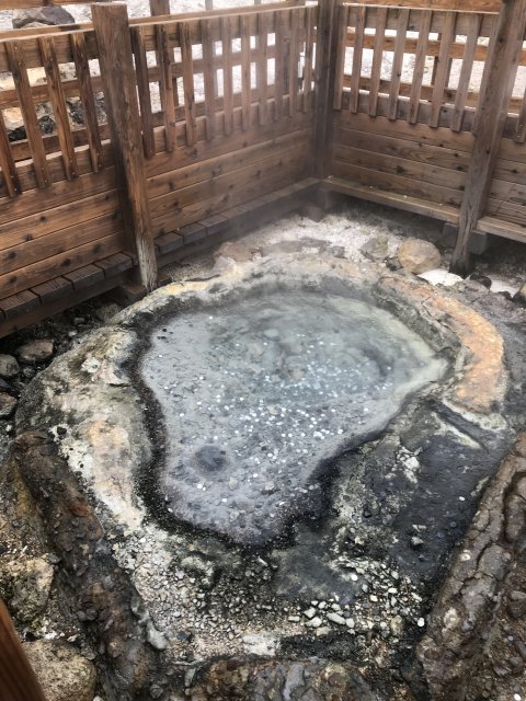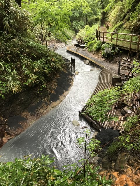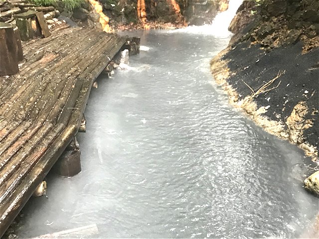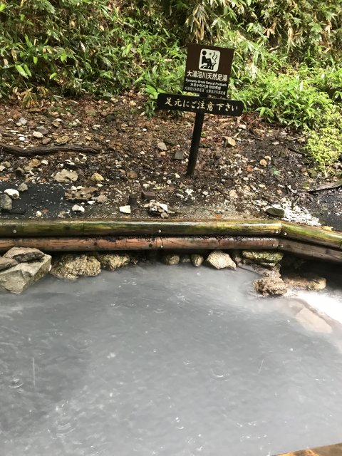 川に沿って木板や丸太が設置されています。シートやタオルを持参するとよい。大湯沼は40-50℃ありますが、大湯沼川の足湯の温度は38℃〜40℃で適温です。肌触りは優しく、肌はスベスベに。