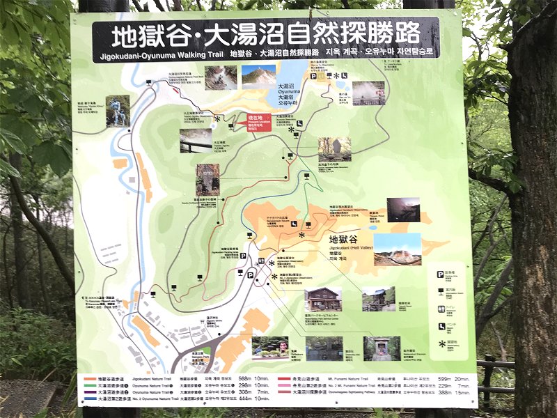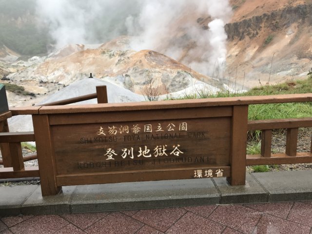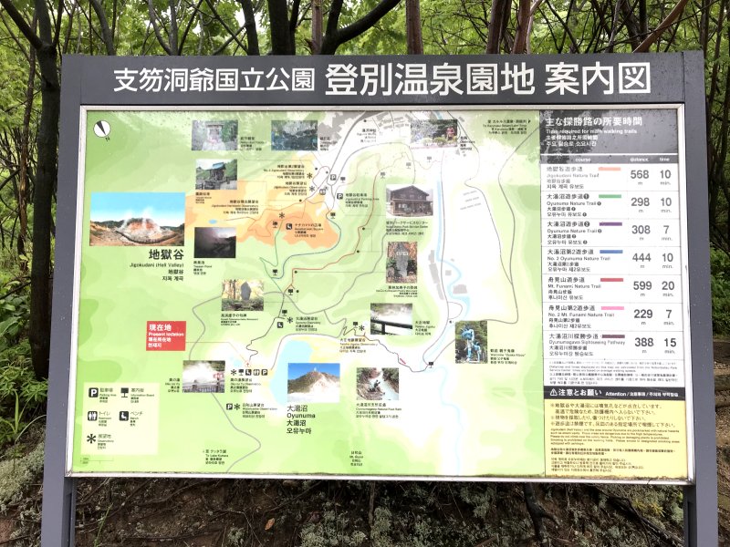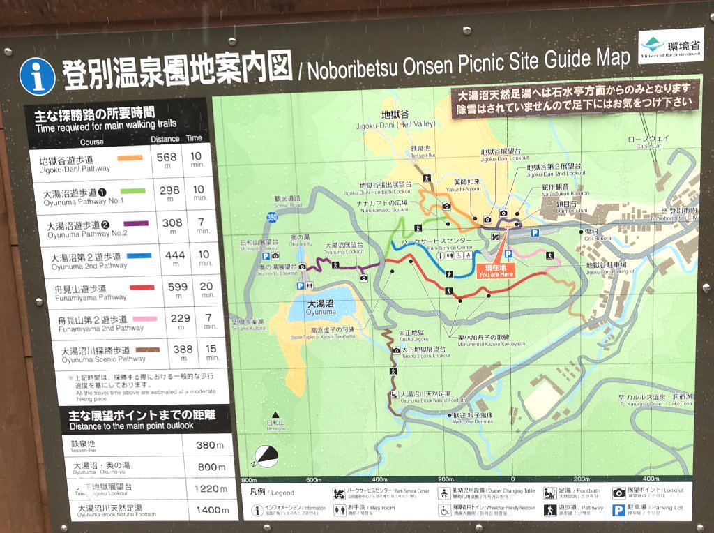 登別温泉+地獄谷で所要時間は、泉源公園(5分)、中心街(商店街)(30分)、奥の湯(10分)、大湯沼(10分)、天然足湯(30分)、地獄谷(30分)、くま牧場(60分)と約3H。