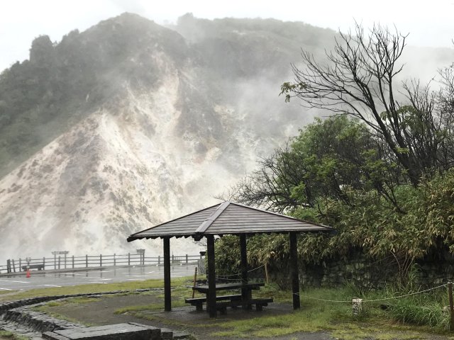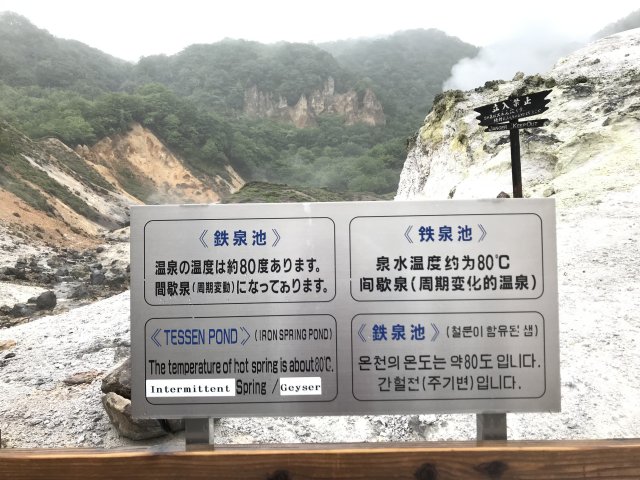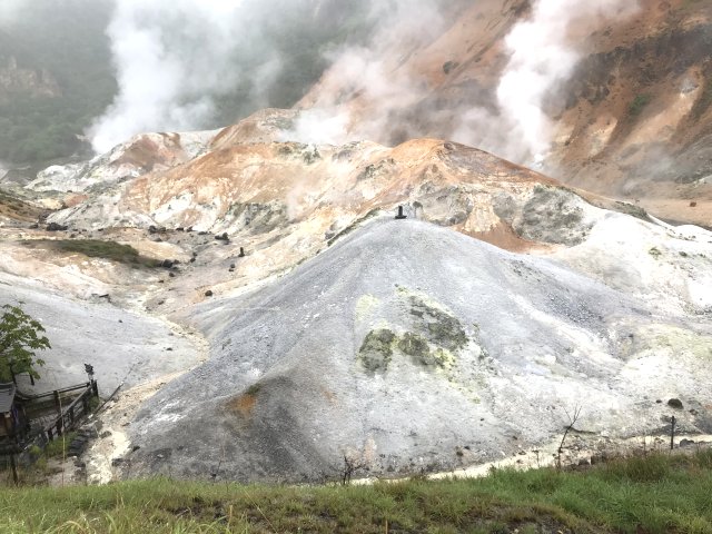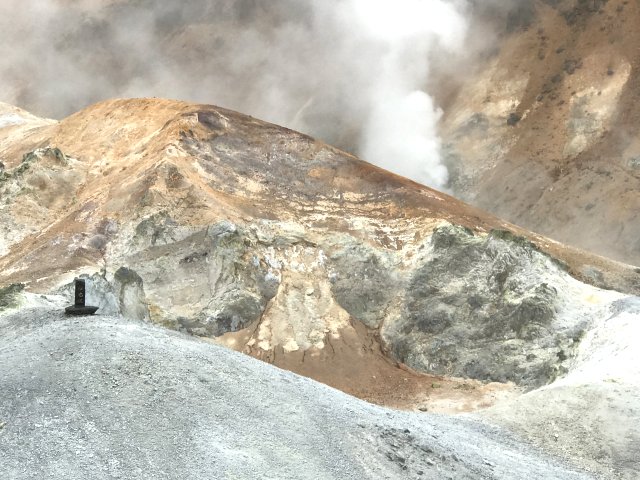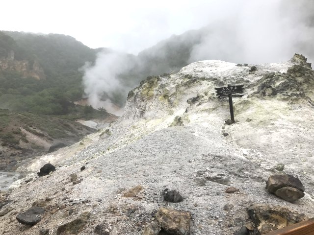 地獄谷は硫黄の強い匂いが立ち込めています。登別パークサービスセンタ前〜鉄泉池で900m,徒歩10分。地獄谷のみの観光なら所要約30分。登別パークサービスセンタには売店、隣にはトイレあり。