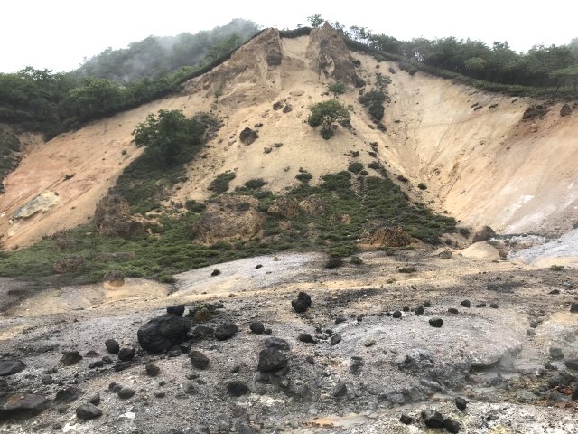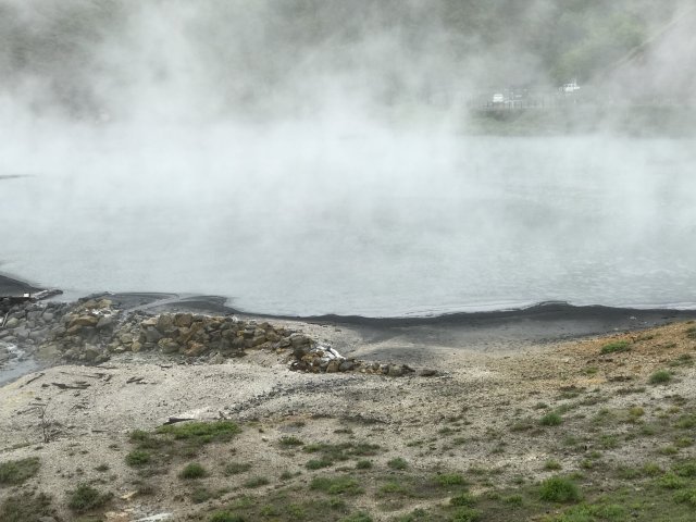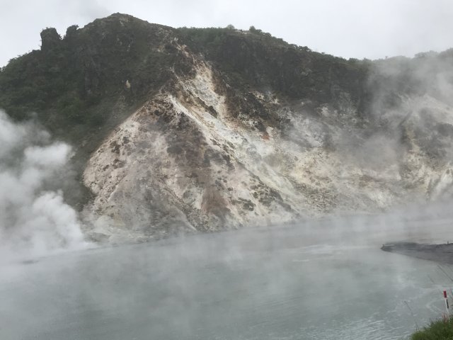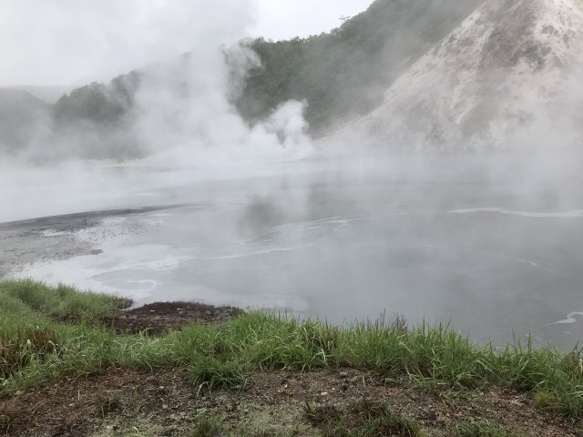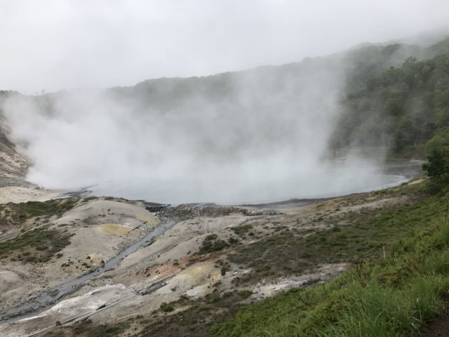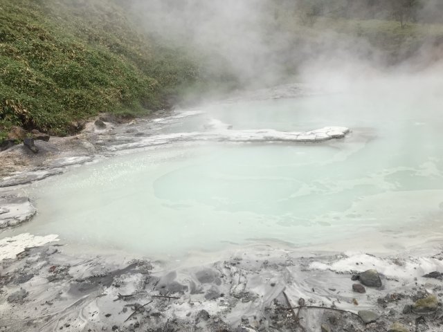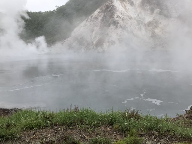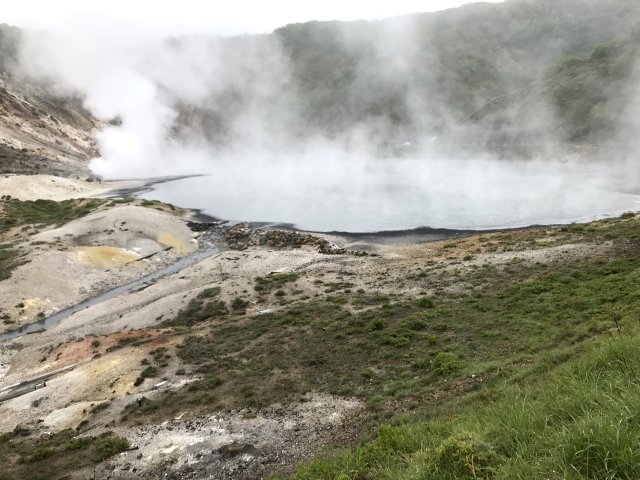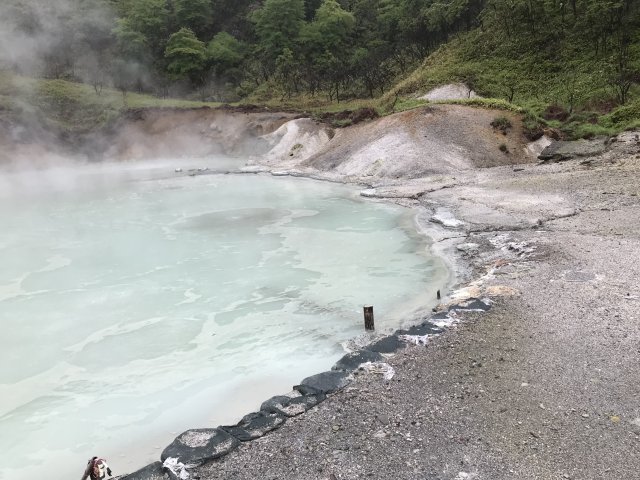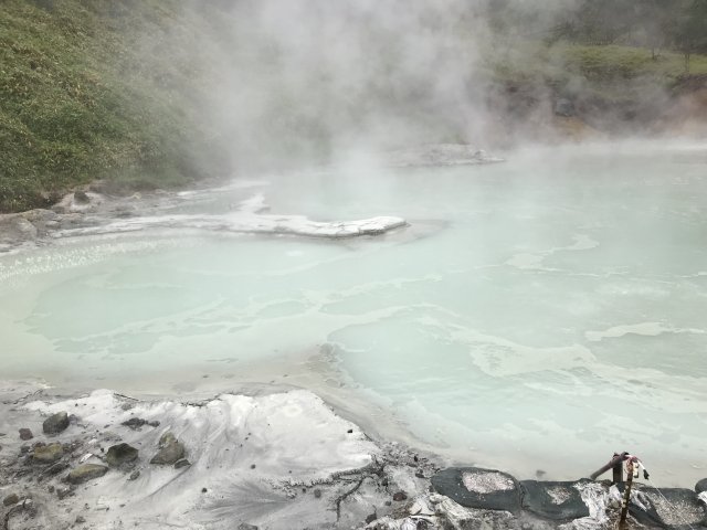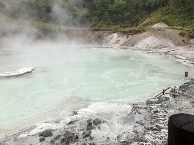 登別「日和山」が8000年前から700年に1回程度の水蒸気噴火を繰り返し、形成された火口跡にお湯がたまってできた周囲1kmのひょうたん型の湯沼。青緑色の水面は40-50℃、底から130℃の熱湯が涌く。