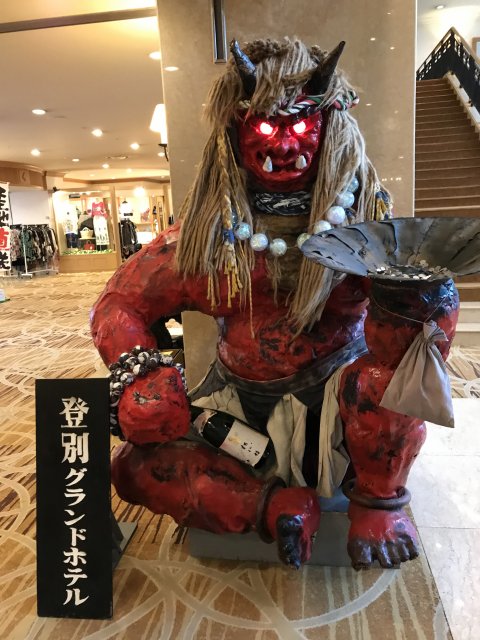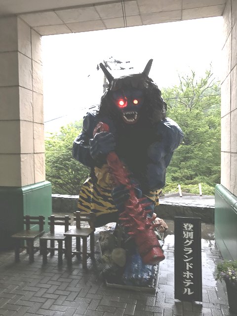 登別グランドHの正面玄関とロビーにも鬼の像があり、目が光っていた。