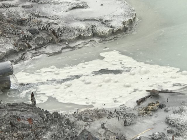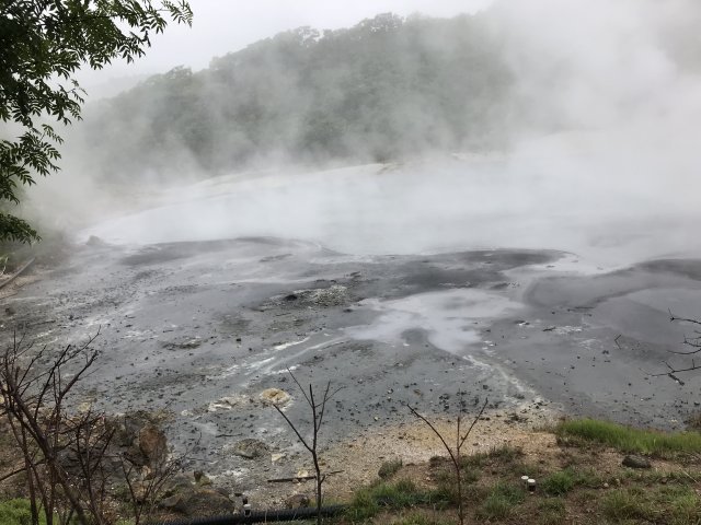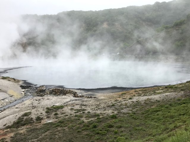 「日和山」(標高377m)の火口跡の一部で円錐形の沼底から灰黒色の硫黄泉が激しく噴出しています。温度は約75℃〜85℃で煮えたぎる湯釜のような沼。沼の手前や中央で噴出が激しく、煮えたぎる湯釜のようです。