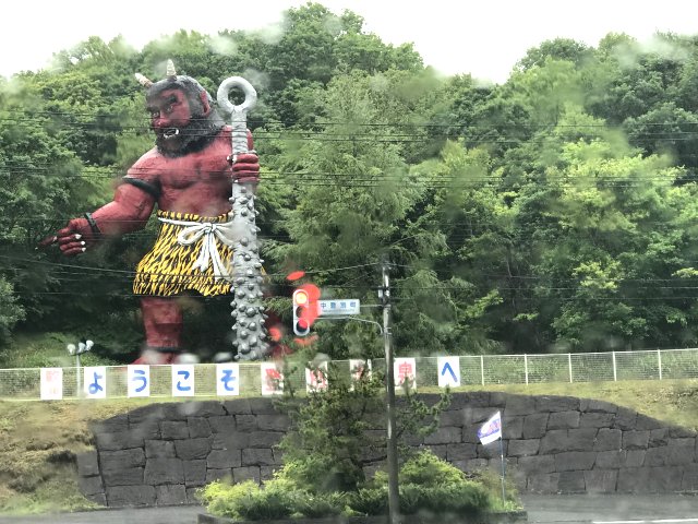 登別温泉のあちらこちらに鬼の像が建っています。道央道・登別東I.Cを降りてすぐの道道2号(洞爺湖登別線)との交差点「中登別町」の真正面に巨大な鬼の像が立ちはだかります。体長18m、重さ18tの巨大な像で歓迎像らしい。