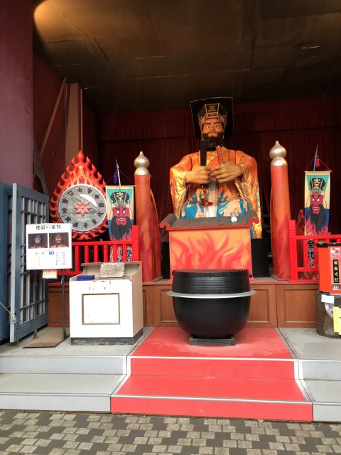 登別温泉街にある閻魔大王が安置されたお堂「閻魔堂」では、1日に6回「地獄の審判」があり、顔が真っ赤になり、手が動くからくり閻魔様です。
