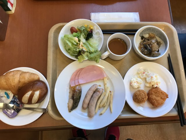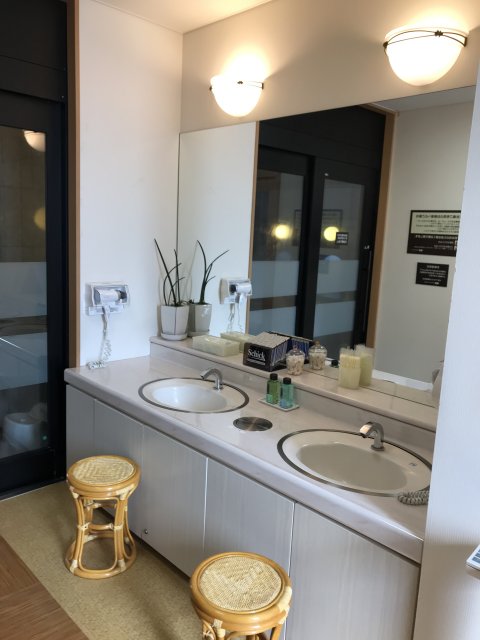 朝食は花茶屋で無料(バイキング)、コーヒー無料(セルフカフェ)。無料Wi-Fi、バストイレ・シャワー・冷暖房・TV・BS・冷蔵庫、自販機、コインランドリー・乾燥機、大浴場(15:00-2:00/朝5:00-10:00)(\15800/1室)