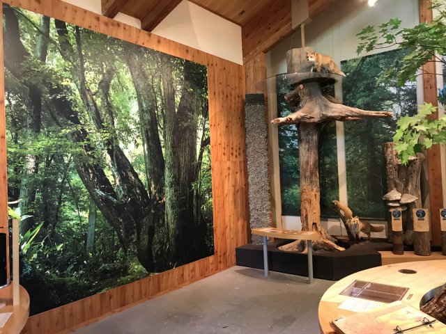 ・「支笏湖ビジターセンタ」では画像やパネル、模型を使って支笏湖の自然や成り立ち、生息する動植物、魚類などを紹介。鳥のさえずりを聞くことができるバードボイス施設や、ヒメマスの水槽、樽前山山麓にある「苔の洞門」の